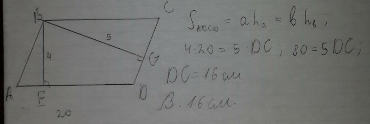 Висоти паралелограма дорівнюють 4 см і 5 см . Більша сторона паралелограма дорівнює 20 см . Знайти меншу сторону паралелограма