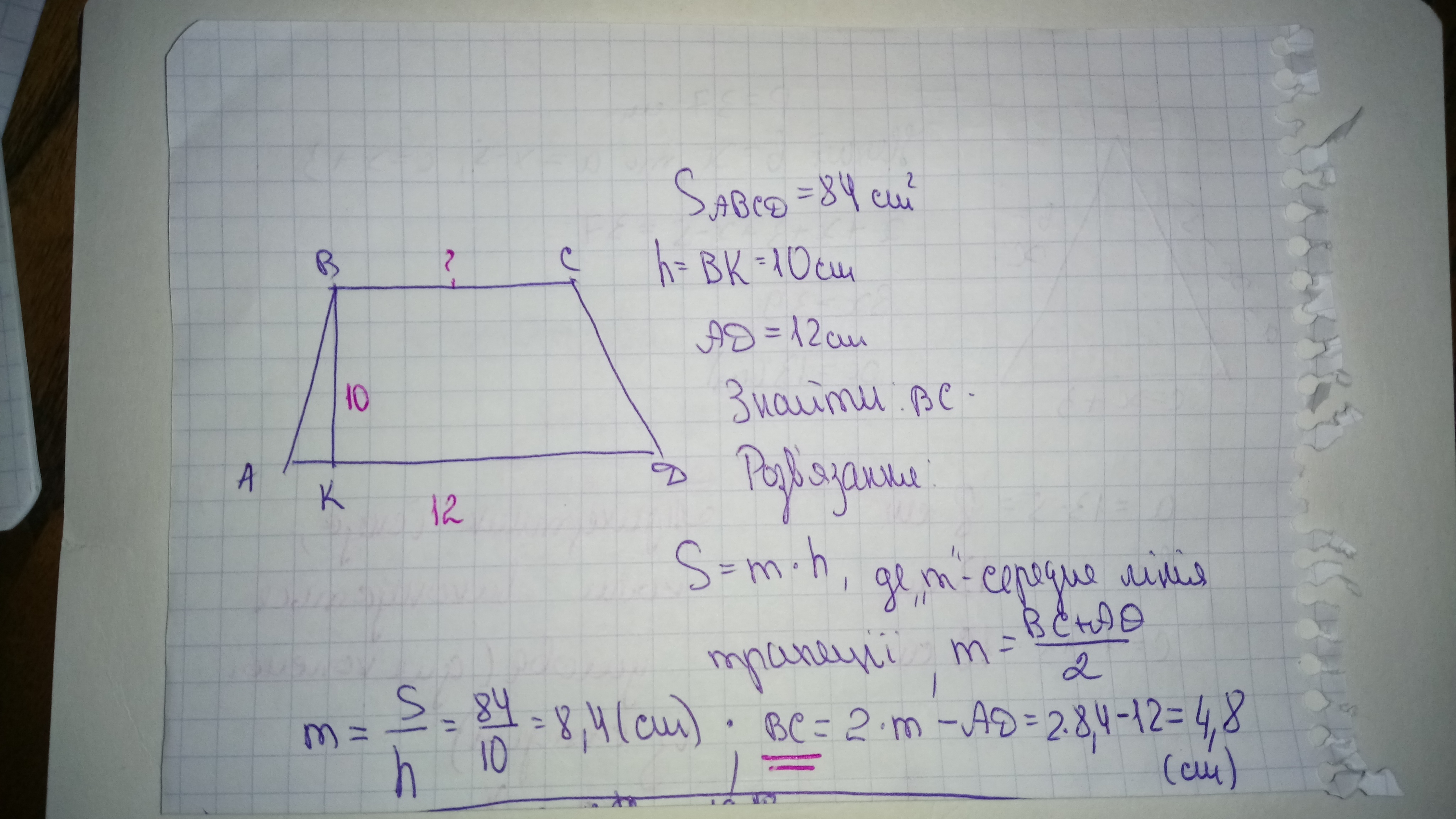 Площа трапеції дорівнює 84 см², висота - 10 см, а більша основа 12- см.Знайти меншу основу трапеції