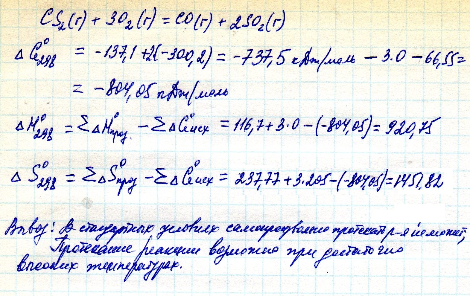 Для указанной реакции вычислить: ΔH0 298, ΔS0 298, ΔG0 298 реакции и сделать вывод о возможности ее самопроизвольного протекания в стандартных условиях. CS2 (г) + 3O2 (г) = СО (г) + 2SO2 (г).