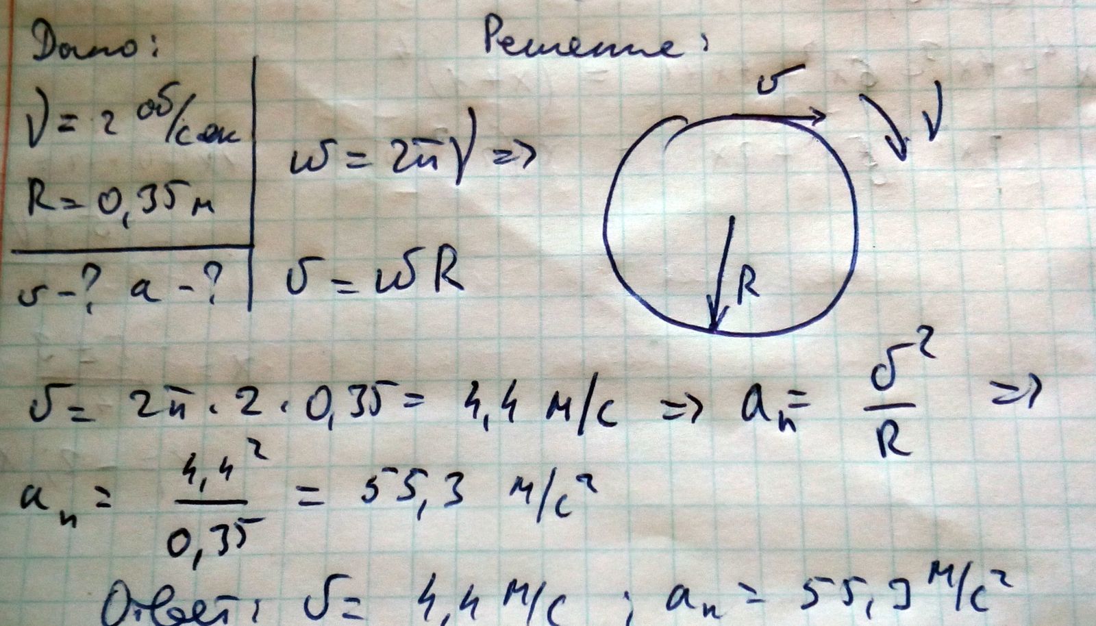 Колесо велосипеда вращается с частотой 2 об/сек. Определите линейную скорость и ускорение точек колеса, если радиус его 0,35 м