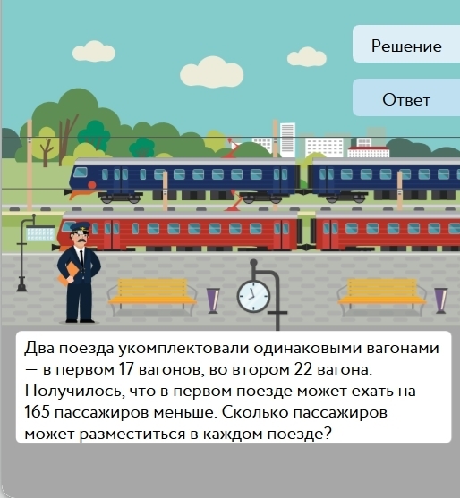В первом на 5 вагонов меньше чем во втором, и на 165 поссажиров меньше. Вычислим сколько мест в одном вагоне. 165:5=33