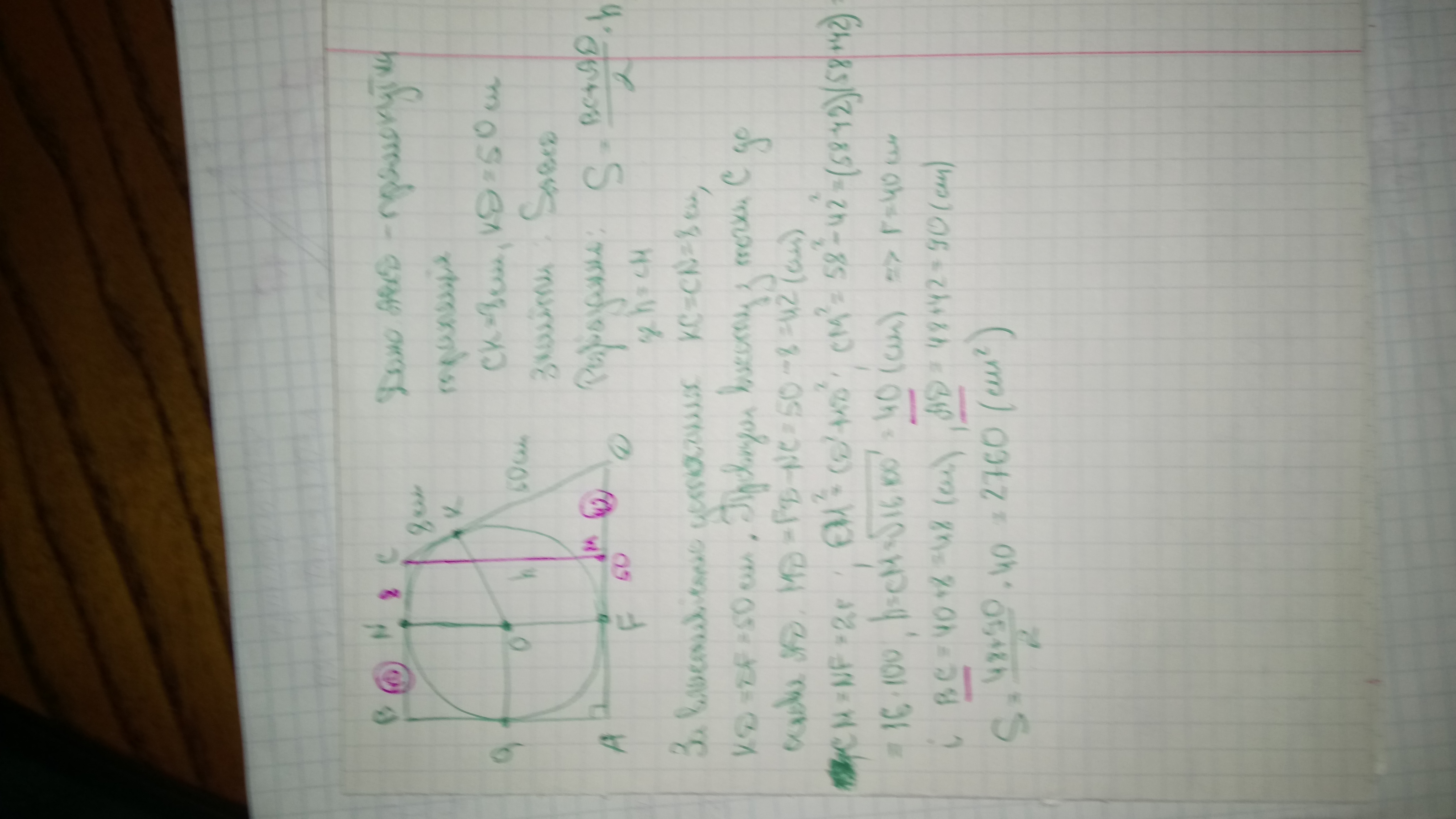 Коло вписане в прямокутну трапецію, ділить точкою дотику більшу бічну сторону на відрізки завдовжки 8см і 50см. Знайдіть площу трапеції.