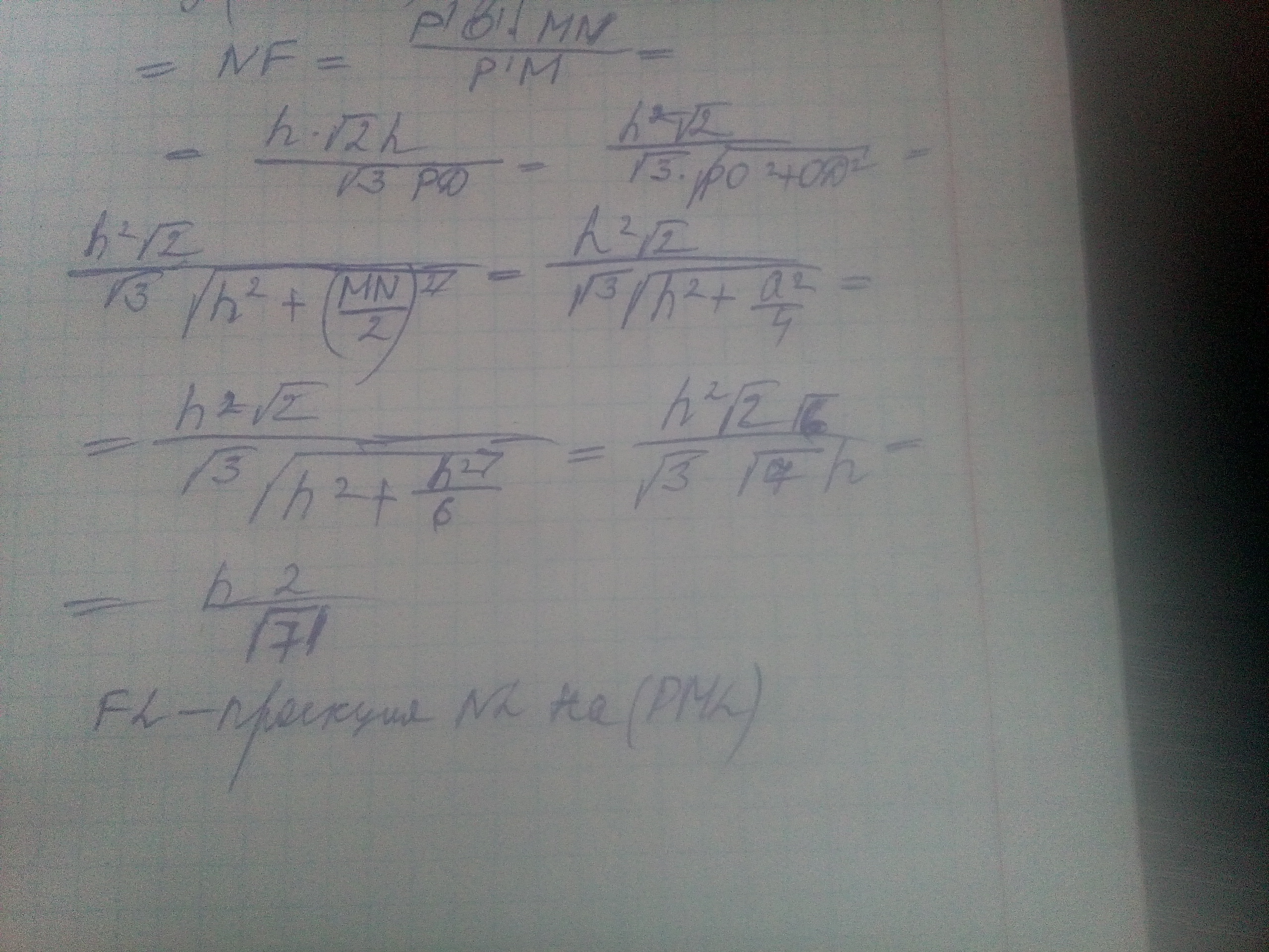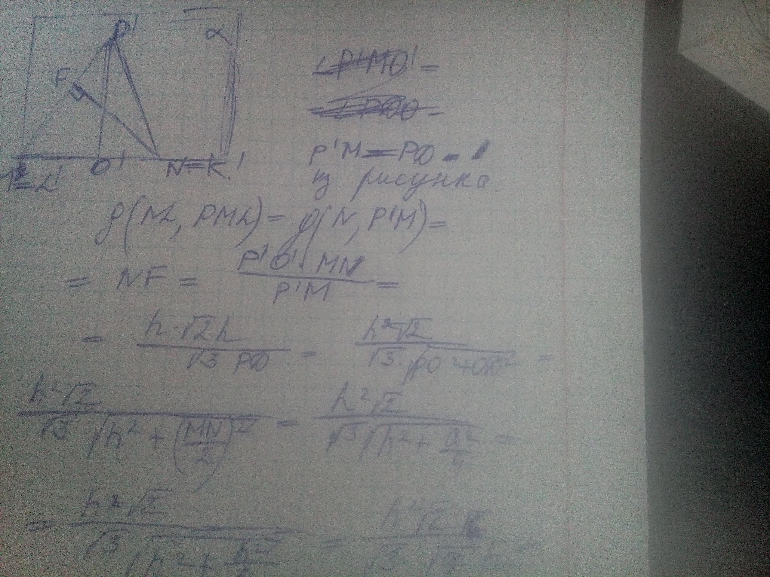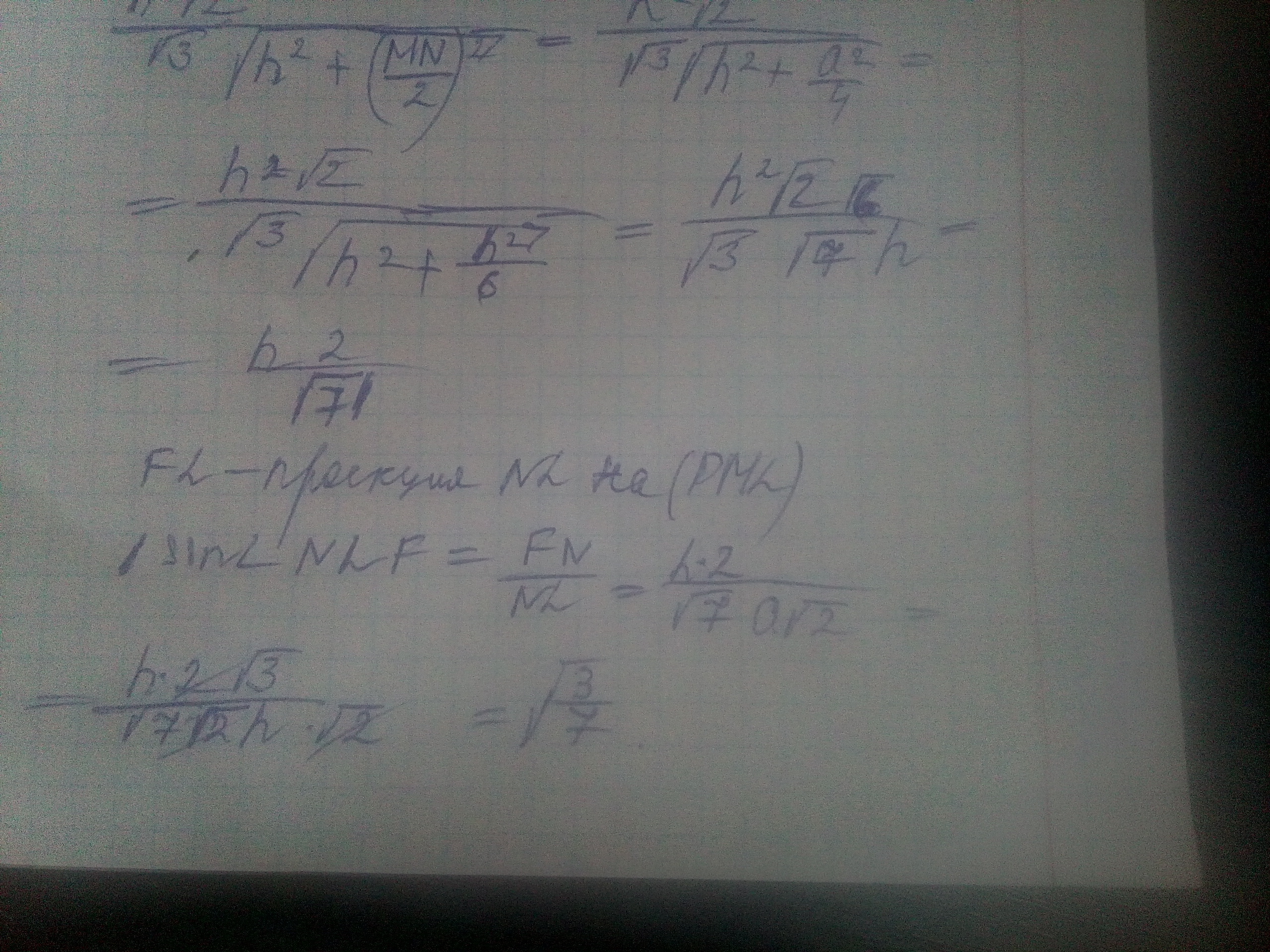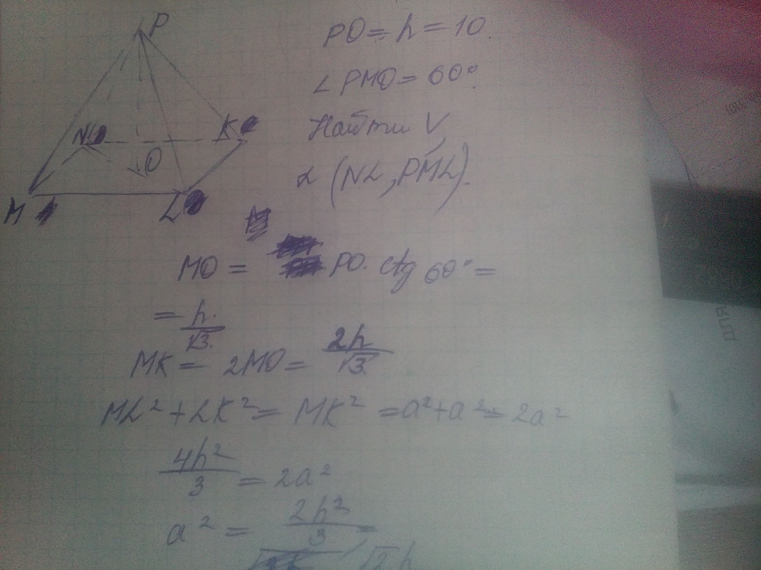 высота правильной четырехугольной пирамиды PMNKL(P-вершина) равна 10,угол между боковым ребром и плоскостью основания равен 60 градусов, найдите объем пирамиды и величину угла между диагональю NL и грань PML.