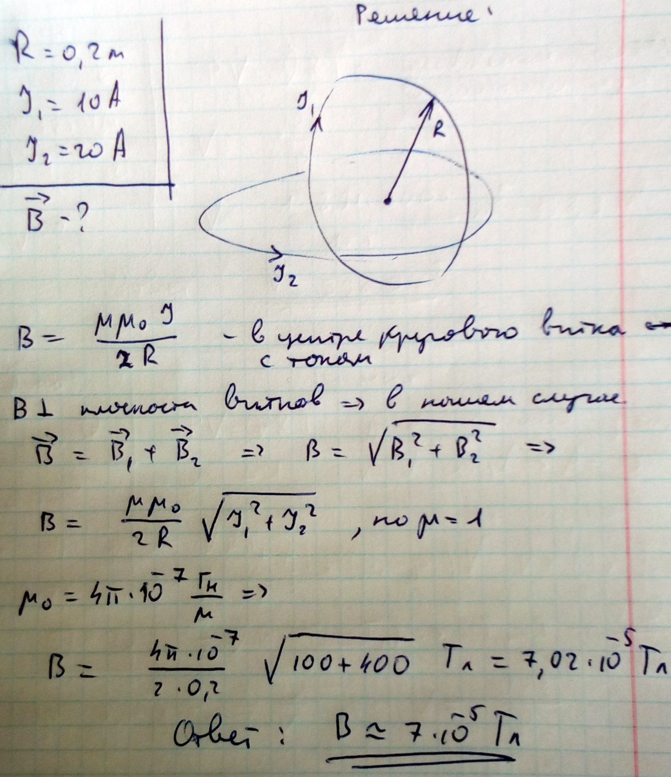 Два круговых витка с током расположены о взаимно перпендикулярных плоскостях так, что их центры совпадают. Найти магнитную индукцию в центре витков, если радиусы витков 20 см, а токи в них 10А и 20А.
