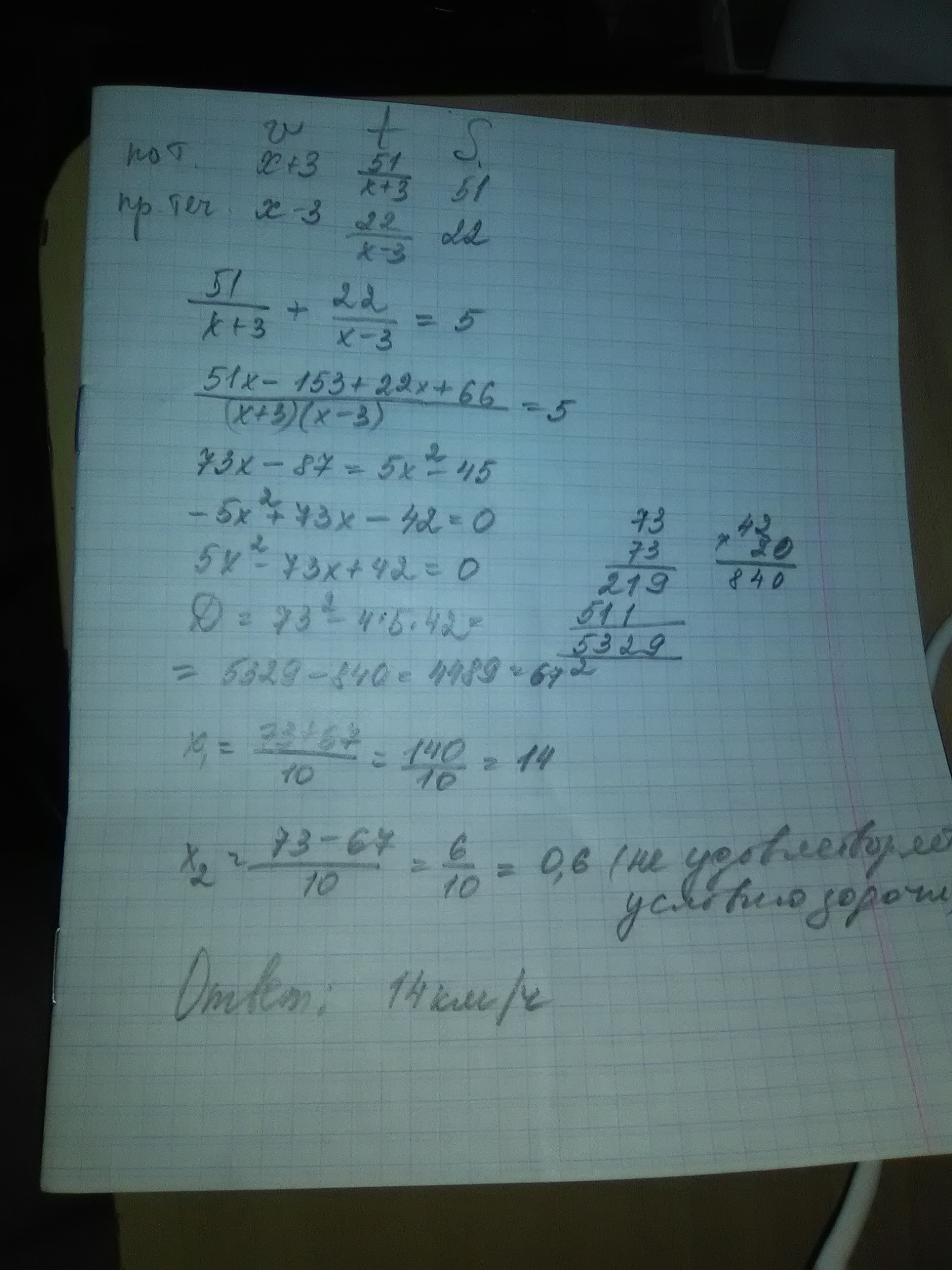 Моторная лодка прошла 51 км за течением и 22 км против течения. Потратив на всю дорогу 5 часов. Скорость течения 3 км/ч. Найти СКРОСТЬ лодки во время движения против течения.
