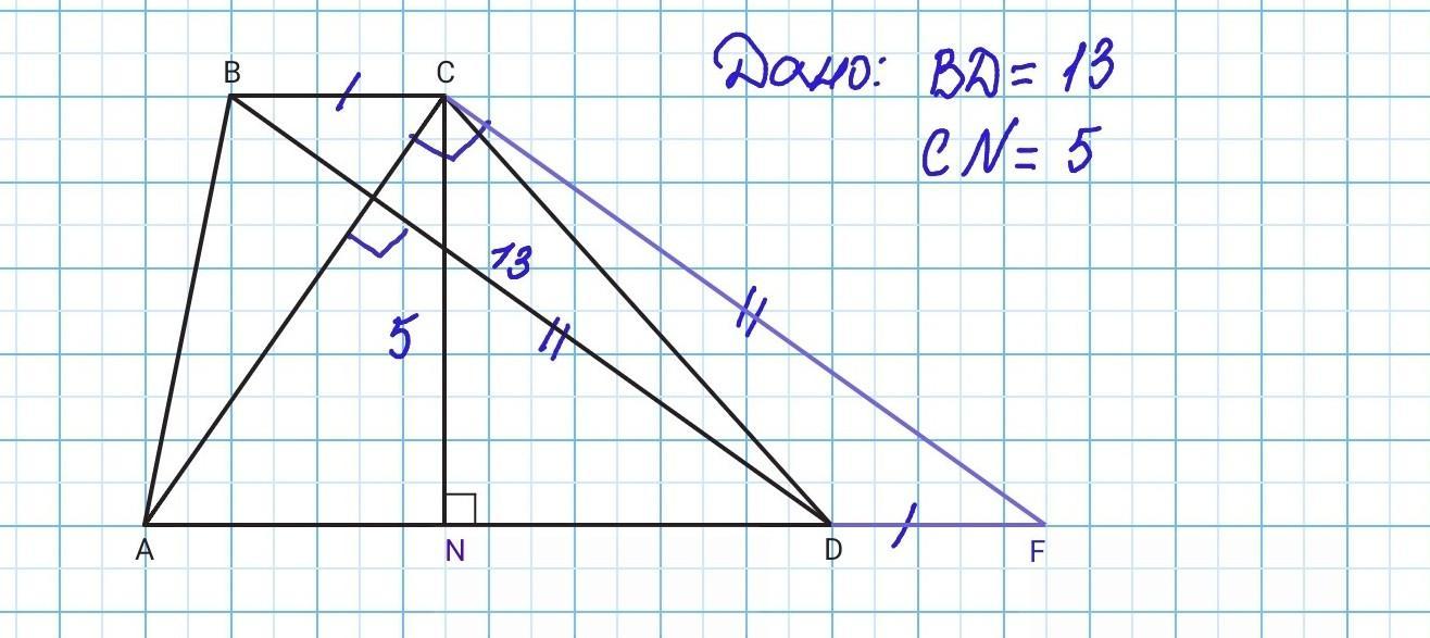 Четырехугольник BCFD — параллелограмм, так как: CF II BD по построению, BC II AD как основания трапеции). =>DF=BC, CF=BD=13
