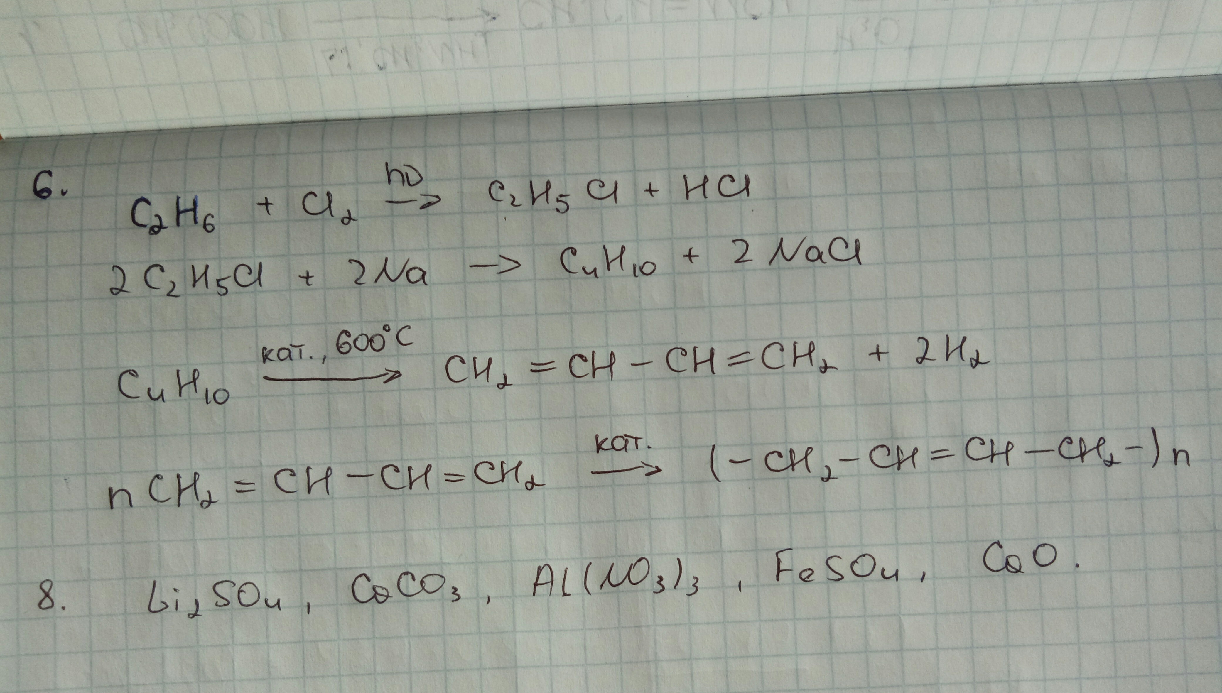 6) Осуществите превращения: C2H6-C2H5Cl-C4H10-C4H6-каучук