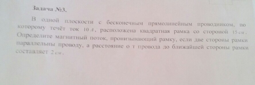 Магнитная индукция вокруг проводника с током вычисляется по закону Био-Савара-Лапласа B = u0*I/2*pi*R, где u0 - магнитная постоянная, I - сила тока, R - расстояние от проводника с током. Для того, чтобы вычислить магнитный поток протекающий через рамку найдём среднее значение вектора магнитной индукции: Bср = (B + B0)/2. Более полное уравнение: Bср = (1.25663706*10^(-6)*10/2*pi*(2 + 15) + 1.25663706*10^(-6)*10/2*pi*2)/2 = 5.588*10^(-7) Тл. После этого можно вычислять магнитный поток: Ф = BS = 5.588*10^(-7)*0.15^2 = 12.573 нВб.