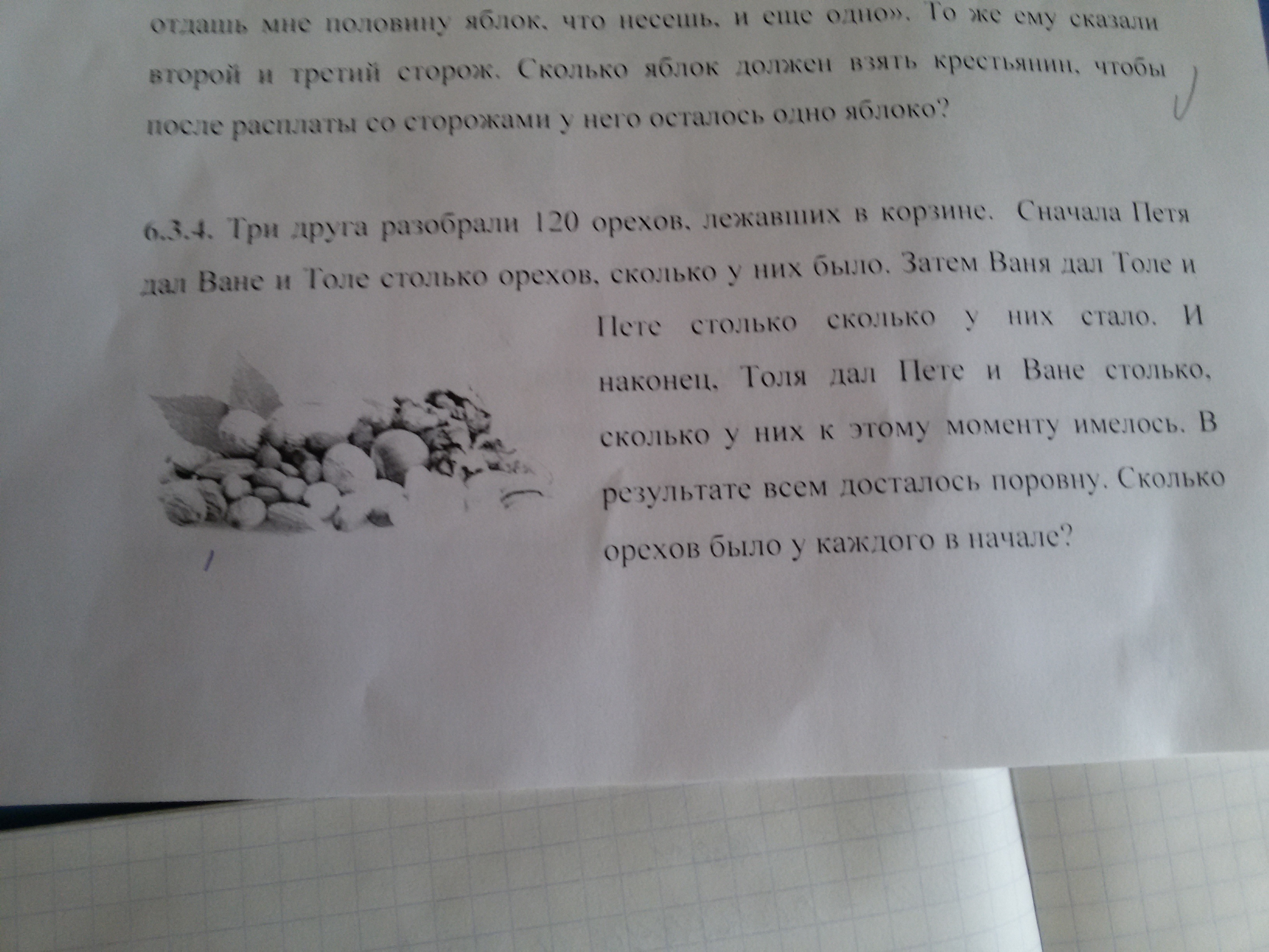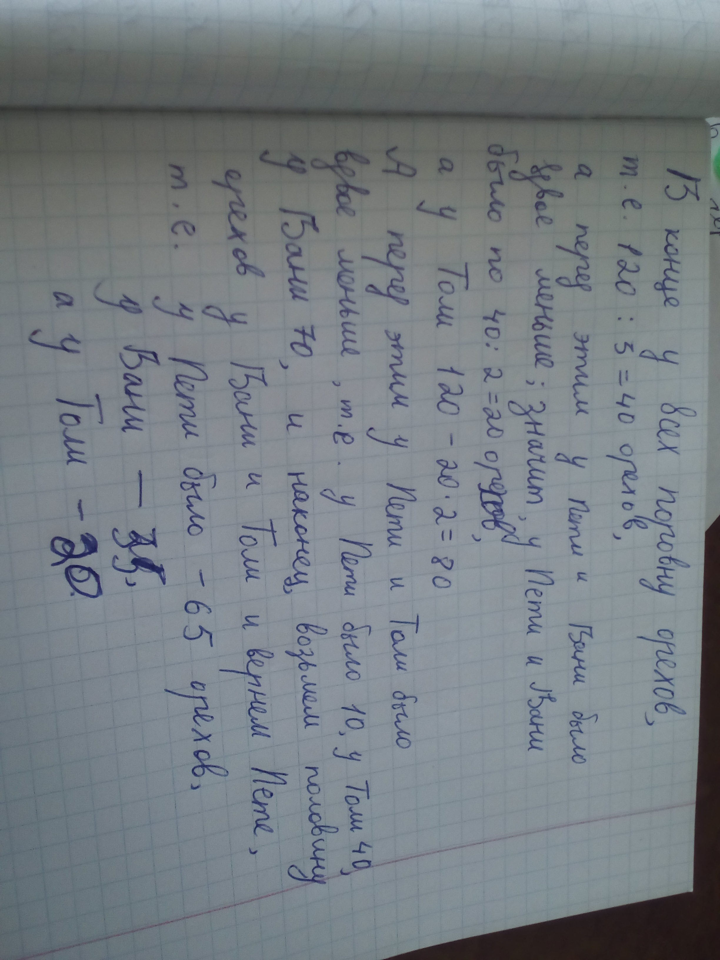ответ: у пети было 65орехов, у вани-35, а у толи-20.