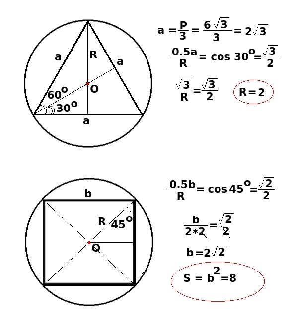 R=2√3/√3=2. А чтобы найти сторону квадрата(а), надо воспользоваться формулой: R=a/√2, тогда: а=√2R=√2*2=2√2. A S(площадь квадрата)=(2√2)²=
