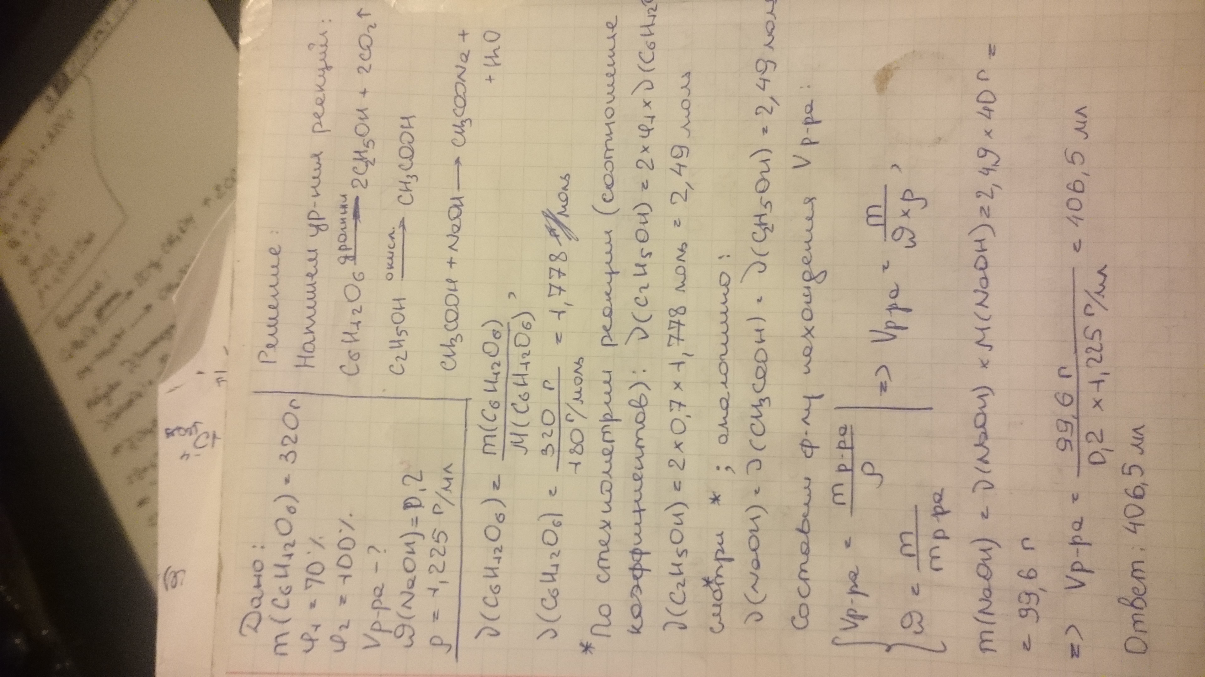 Глюкоза массой 320 г было подвергнута спиртовому брожению с выходом 70%. Полученный спирт с выходом 100% превратили в соответствующую кислоту. Определите объем раствора гидроксида натрия (w = 0,2; ρ = 1,225 г/мл), который нужен для нейтрализации полученной кислоты.