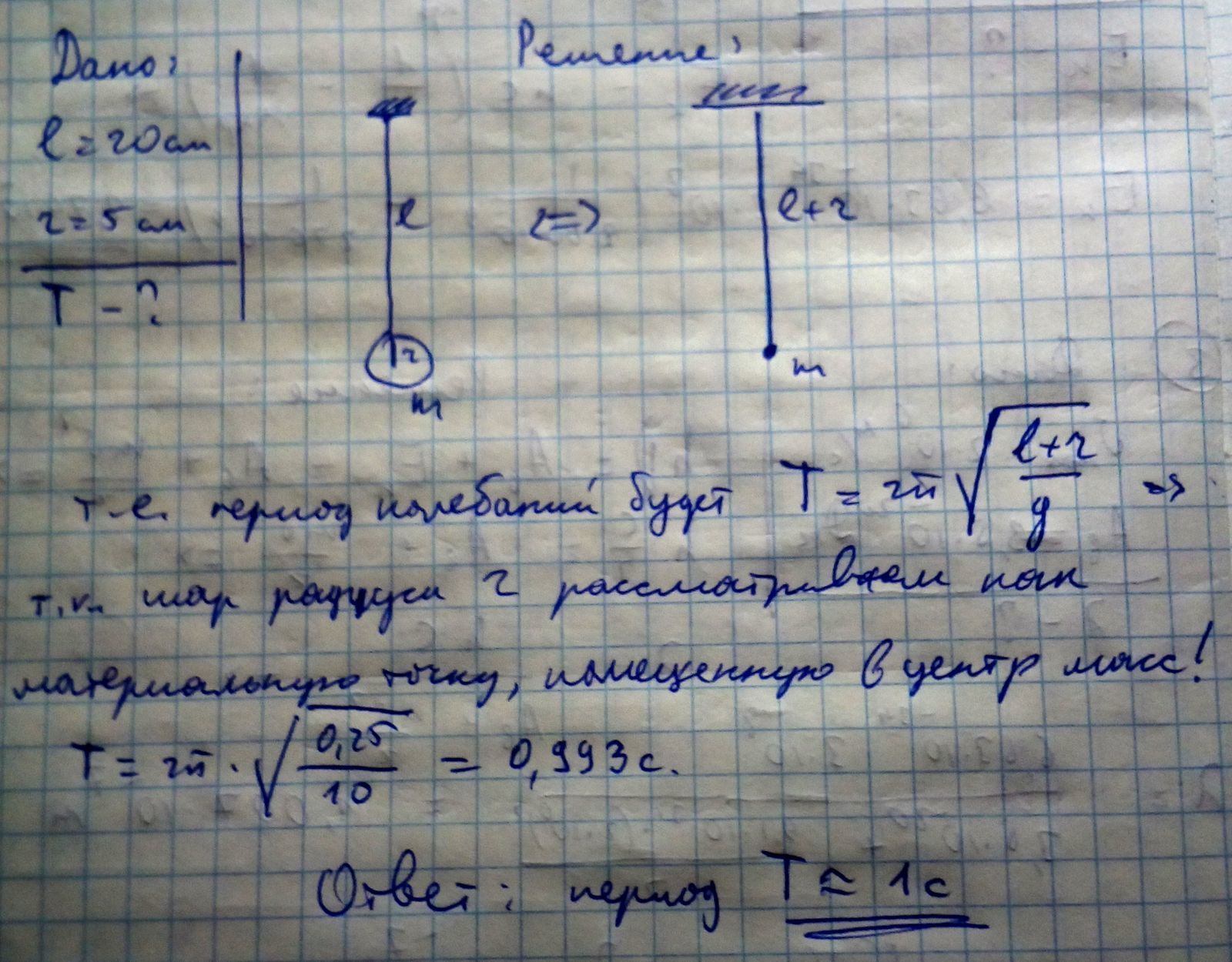 к нити длиной 20см подвесили металлический шарик радиусом 5 см. определить период колебаний получившегося маятника.