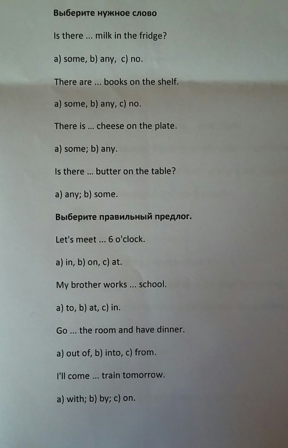 any milk, some books, some cheese, any butter at 6 o'clock, at school, into the room, by train