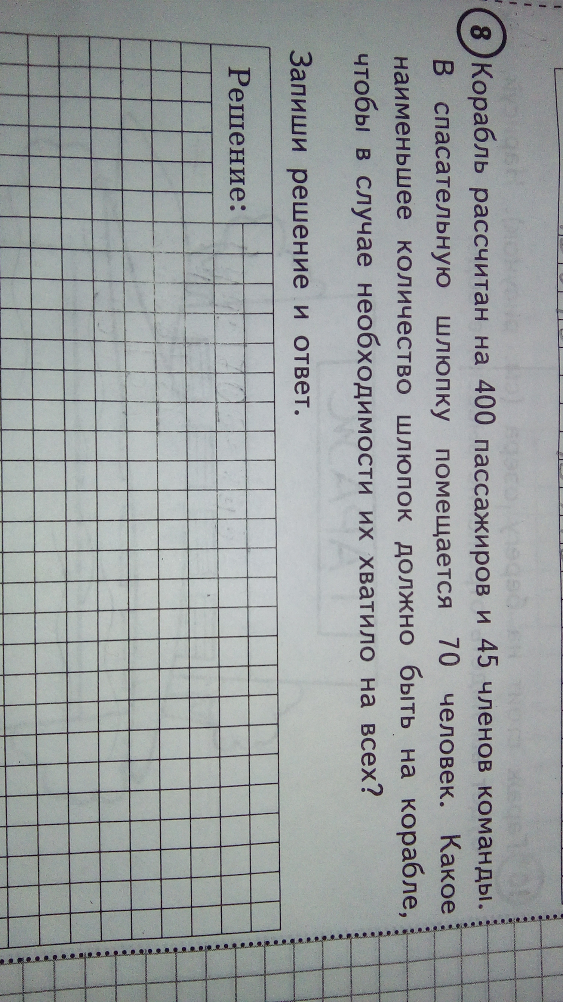 445 : 70 = 6,35 , т.е. Минимум необходимо 7 шлюпок для всех