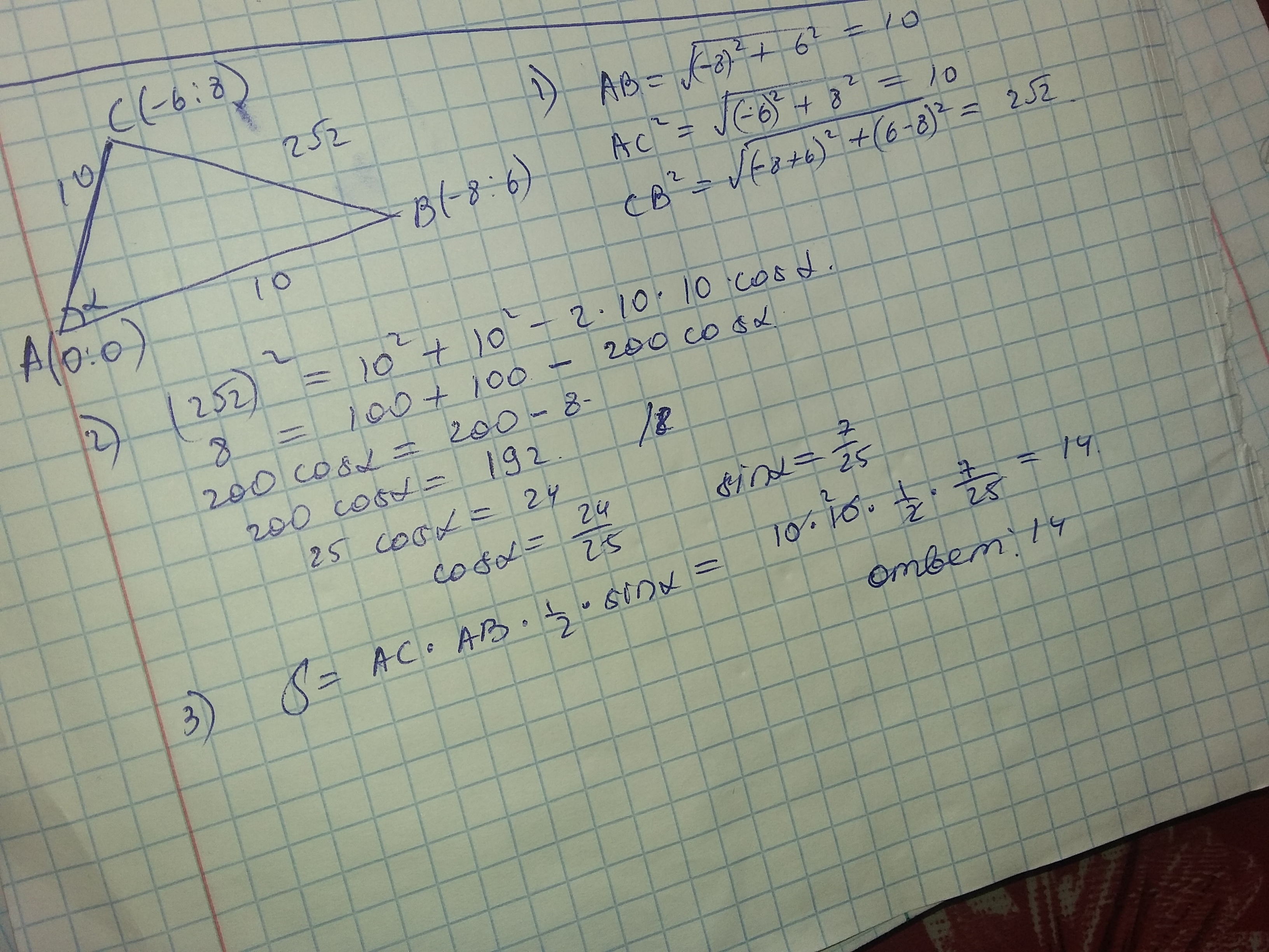 Составим вектора: AB = (-8-0 ; 6-0) = (-8;6); AC = (-6-0;8-0) = (-6;8);