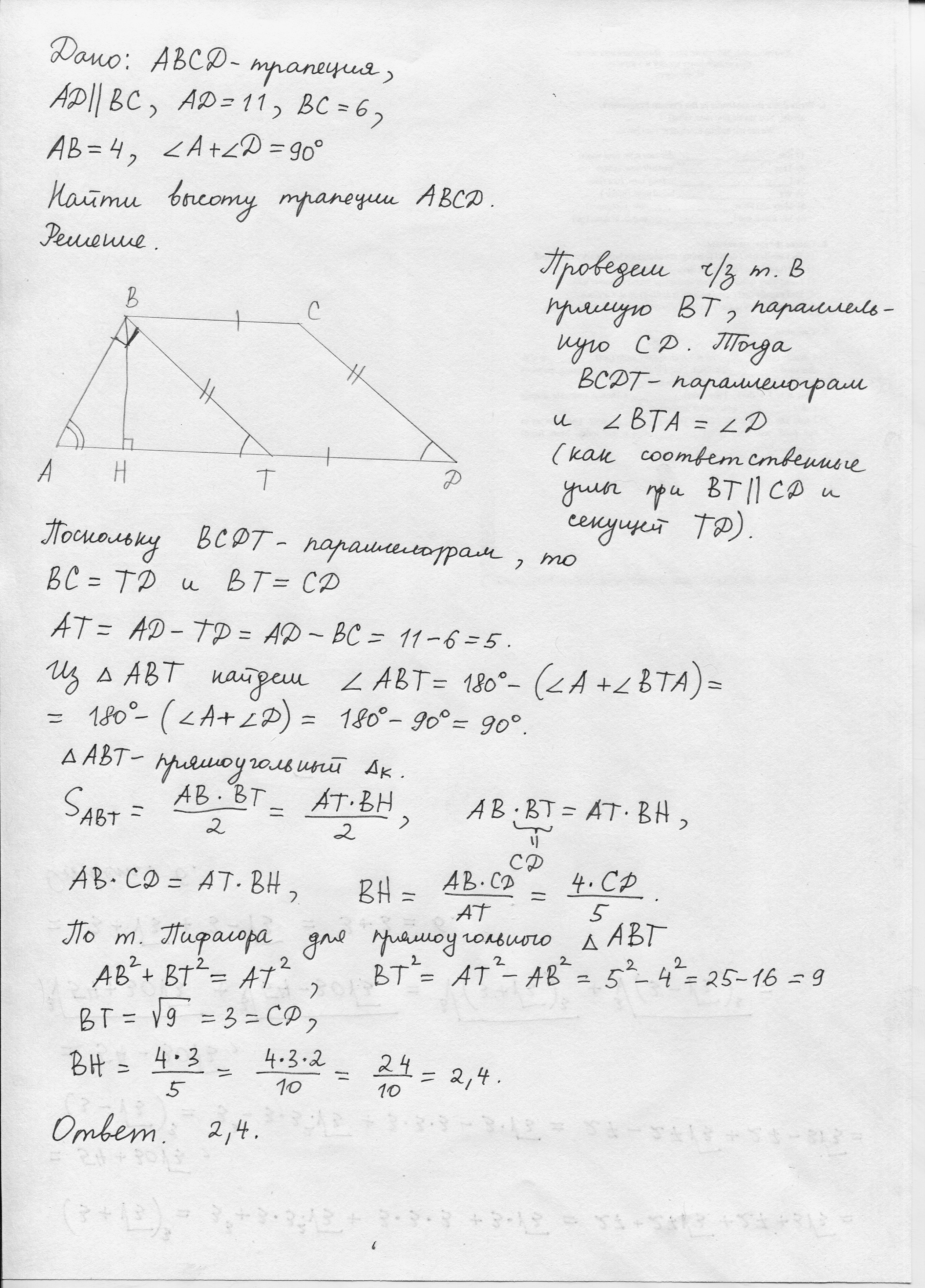 Основания трапеции равны 11 и 6. Одна боковая сторона, равна 4. А сумма углов основания равна 90 градусов. Найти высоту.