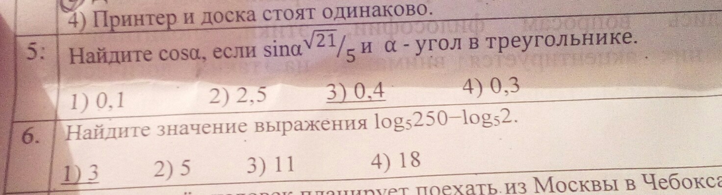 5). sin^a+cos^2a=1. выражаем cosa : cosa=(1-sin^2a)^1/2. подставляем значение: cosa=(1-(корень из 21/5)^2)^1/2=(1-21/25)^1/2=(4/25)^1/2=2/5=0,4.Ответ:цифра 3. 6).Log(5) 250-Log(5) 2=Log(5) 250/2=Log(5) 125=Log(5) 5^3=3Log(5) 5=3. Ответ: цифра 1.