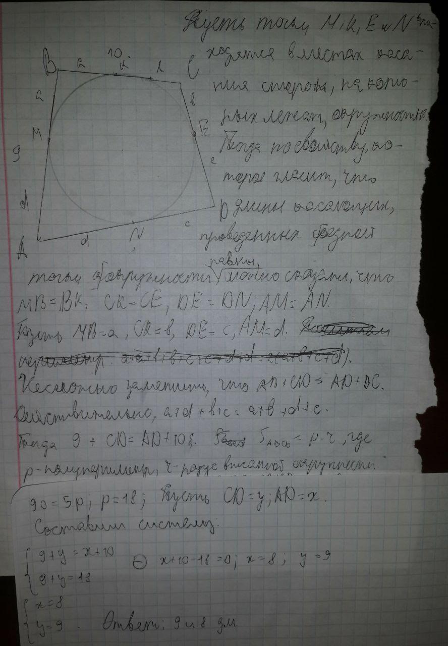 Площадь четырехугольника ABCD,описанного около окружности радиуса 5 дм, равна 90кв. дм. Найдите стороны CD и AD этого четырехугольника, если AB=9 дм, BC=10 дм.