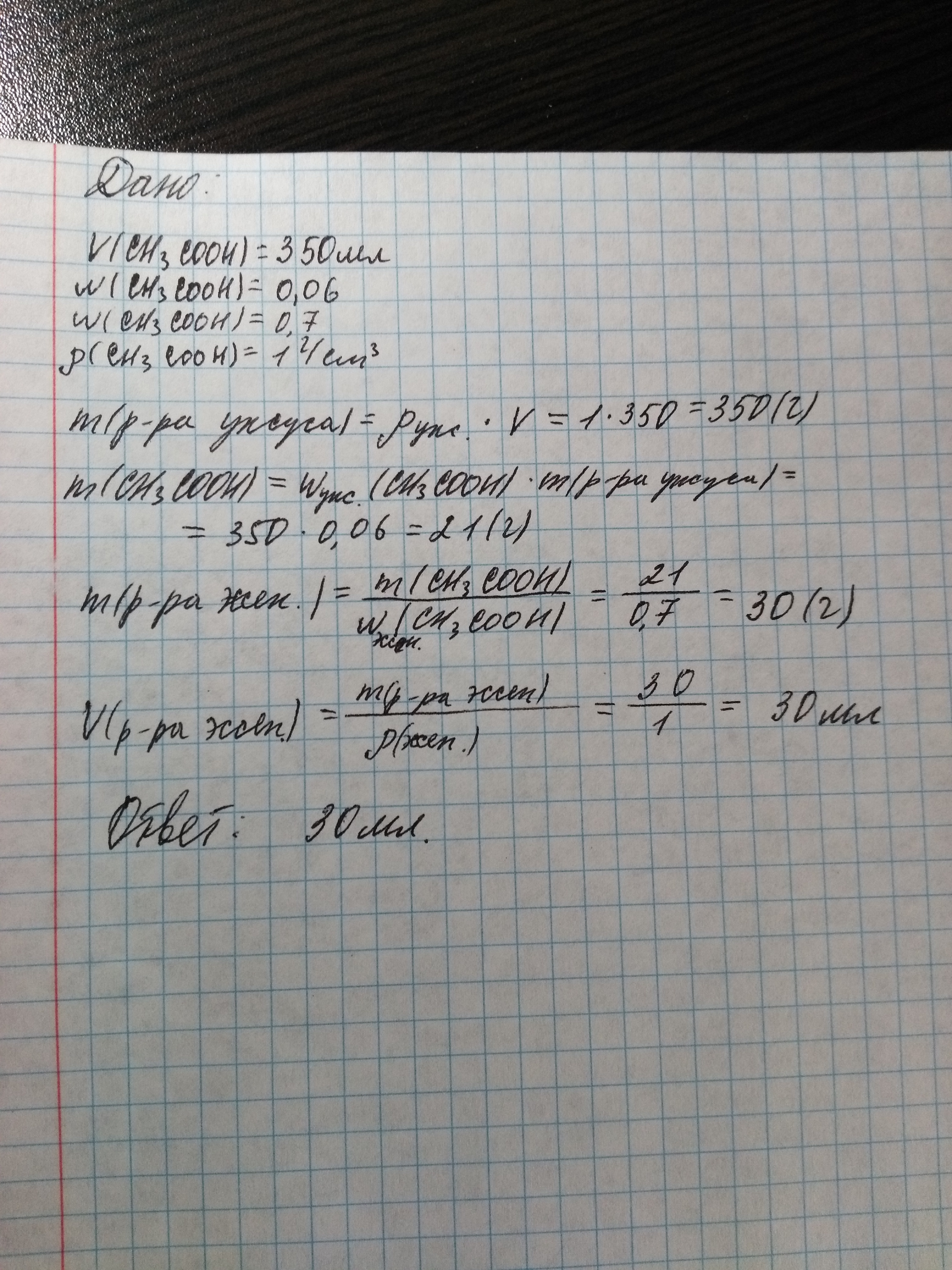 Уксусная эссенция - это 70% раствор уксусной кислоты СН3СООН. Вычислите, сколько миллилитров уксусной эссенции и воды необходимо для приготовления 350 мл 6% раствора уксуса, приминяемого в качестве приправы к пище. Плотность раствора уксусной кислоты можно принять равной 1,0 г/см3
