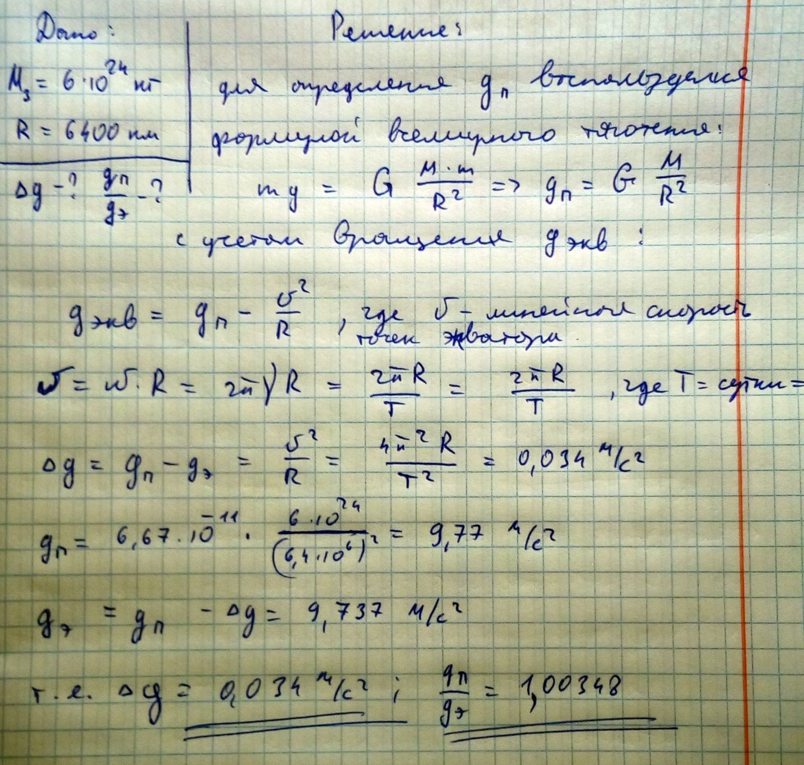 Определить разницу в ускорении свободного падения на полюсах Земли и экваторе, обусловленную вращением Земли. Радиус Земли считать равным 6400 км.