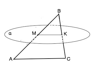 Плоскость α параллельна АС, следовательно, МК, линия пересечения плоскостей АВС и α, параллельна АС.