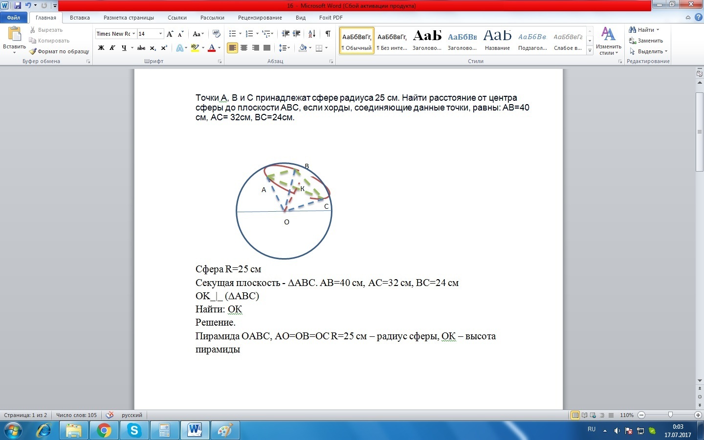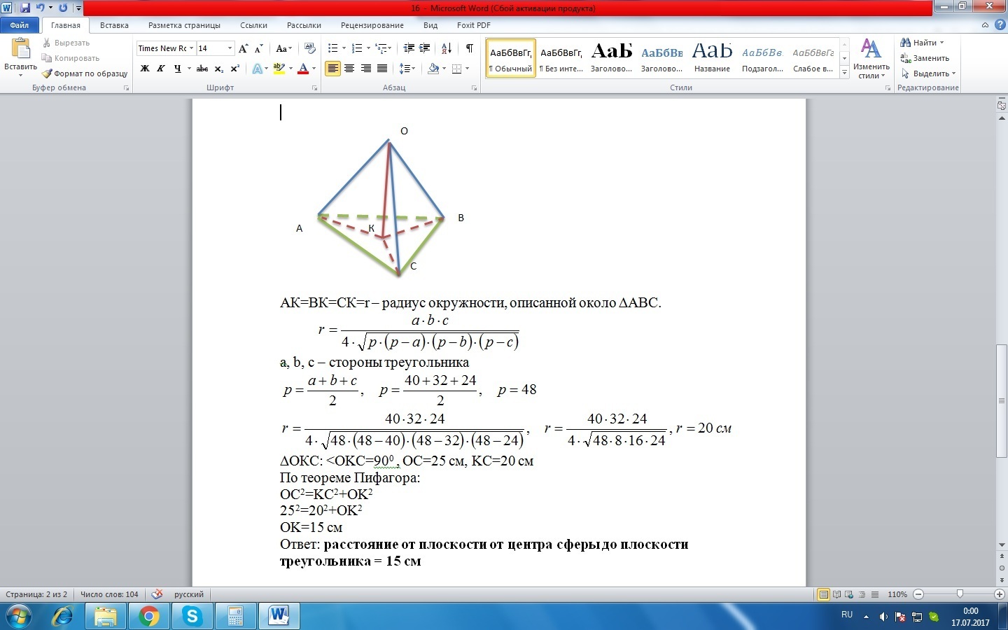 Точки А, В и С принадлежат сфере радиуса 25 см. Найти расстояние от центра сферы до плоскости АВС, если хорды, соединяющие данные точки, равны: АВ=40 см, АС= 32см, ВС=24см.