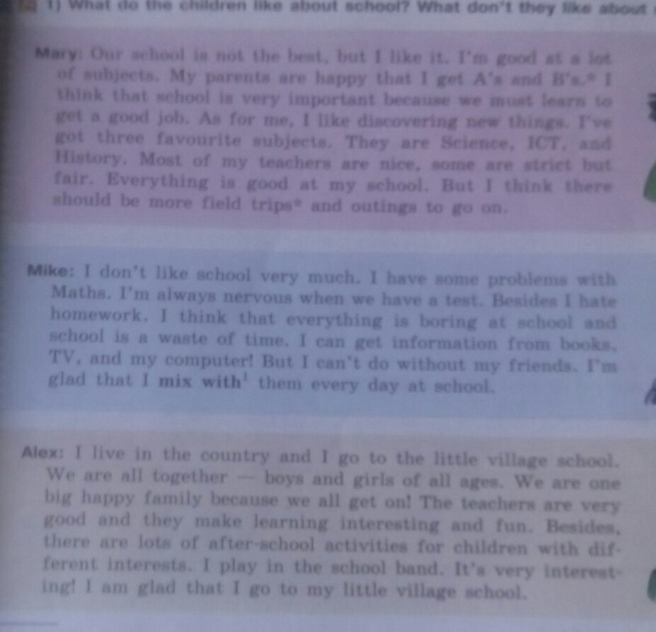 Мне не нравится школа. У меня проблемы с математикой. Я всегда нервничаю, когда пишу контрольную работу. Кроме того, я ненавижу выполнять домашнюю работу. Я считаю, что все это скучным и пустой тратой времени. Я могу получать информацию из книг, телевизора и компьютера. Но я не могу ободиться без своих друзей.