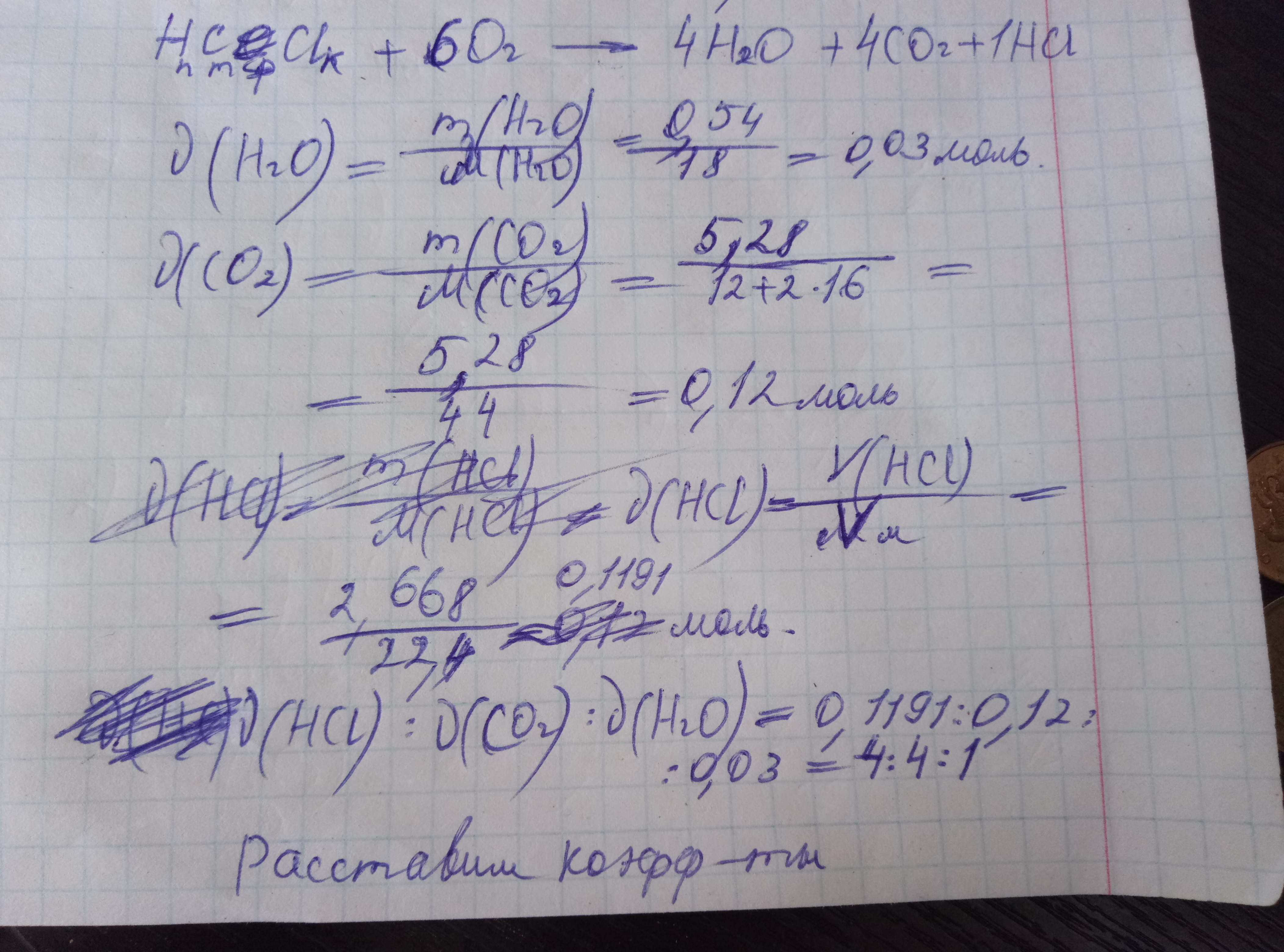 при сгорании вещества А выделилось 0,54 г воды углекислого газа 5,28г ,2,668л хлороводорода