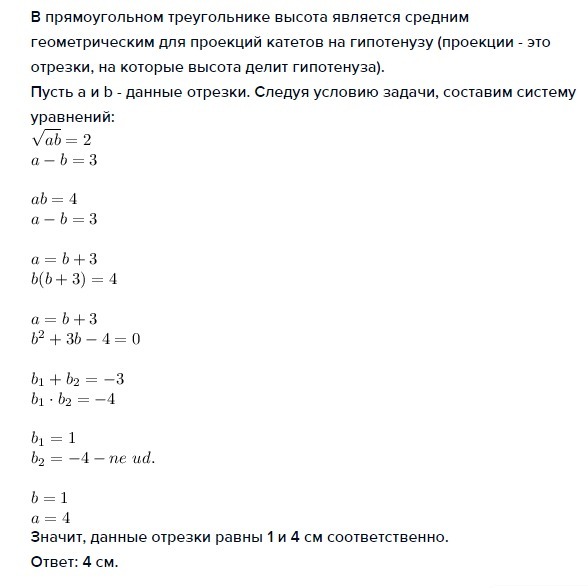 В прямоугольном треугольнике высота h делит гипотенузу на два отрезка, разность которых равнаи3 см. Найдите наибольший из этих отрезков, если h=2 см.