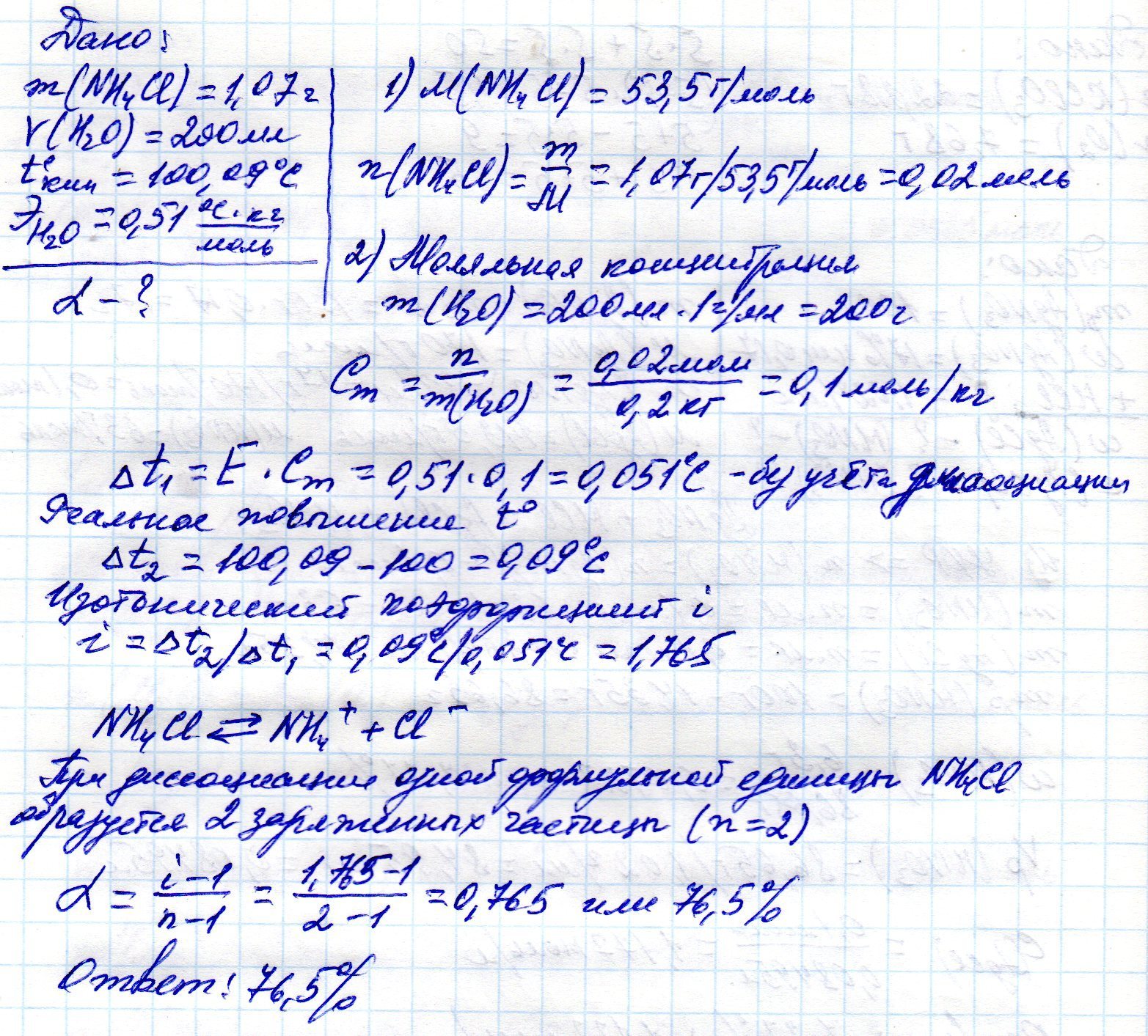 Прошу помогите с химией )Найдите значение степени диссоциации хлорида аммония в растворе, для приготовления которого 1,07 г соли растворили в 200 мл воды. Температура кипения полученного расвтора оказалась равной 100,09 С0.ЭH2=0,51 0С*кг*моль-1