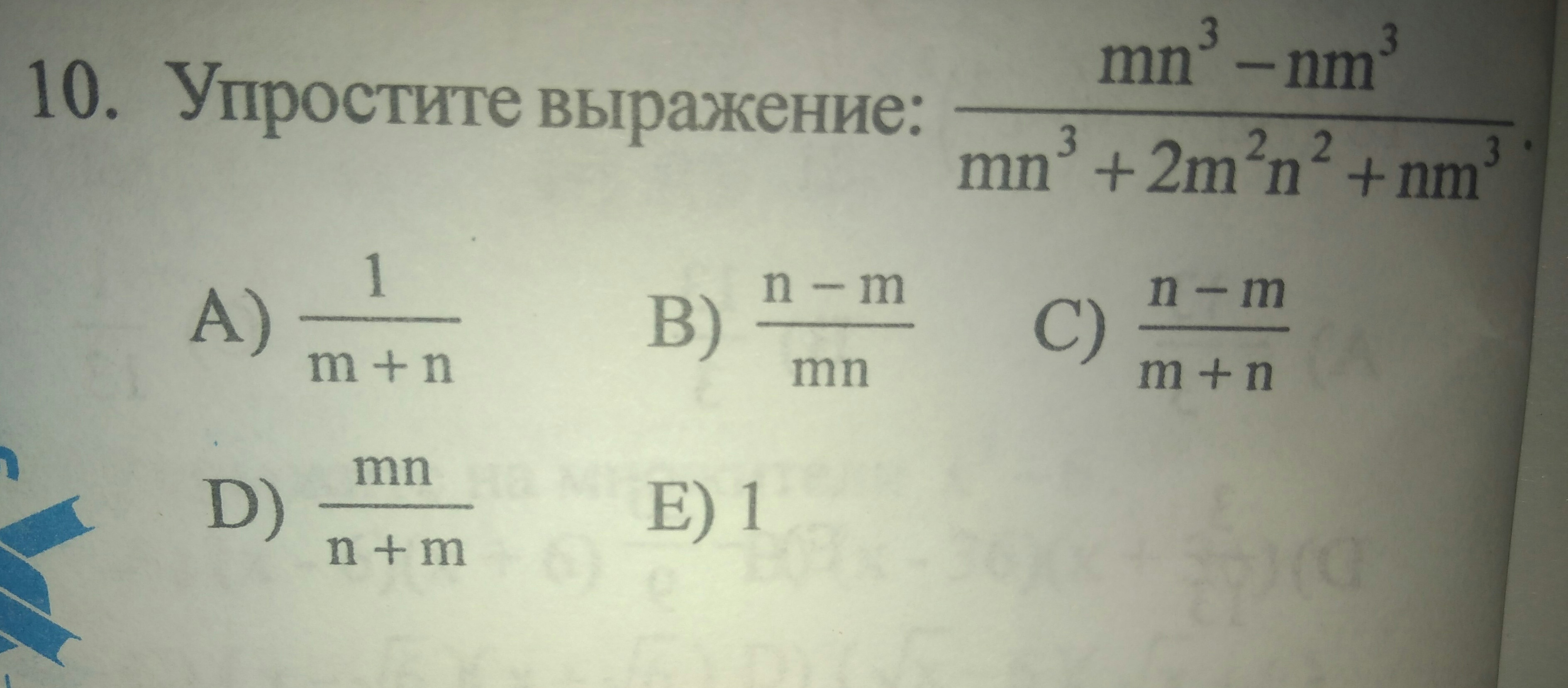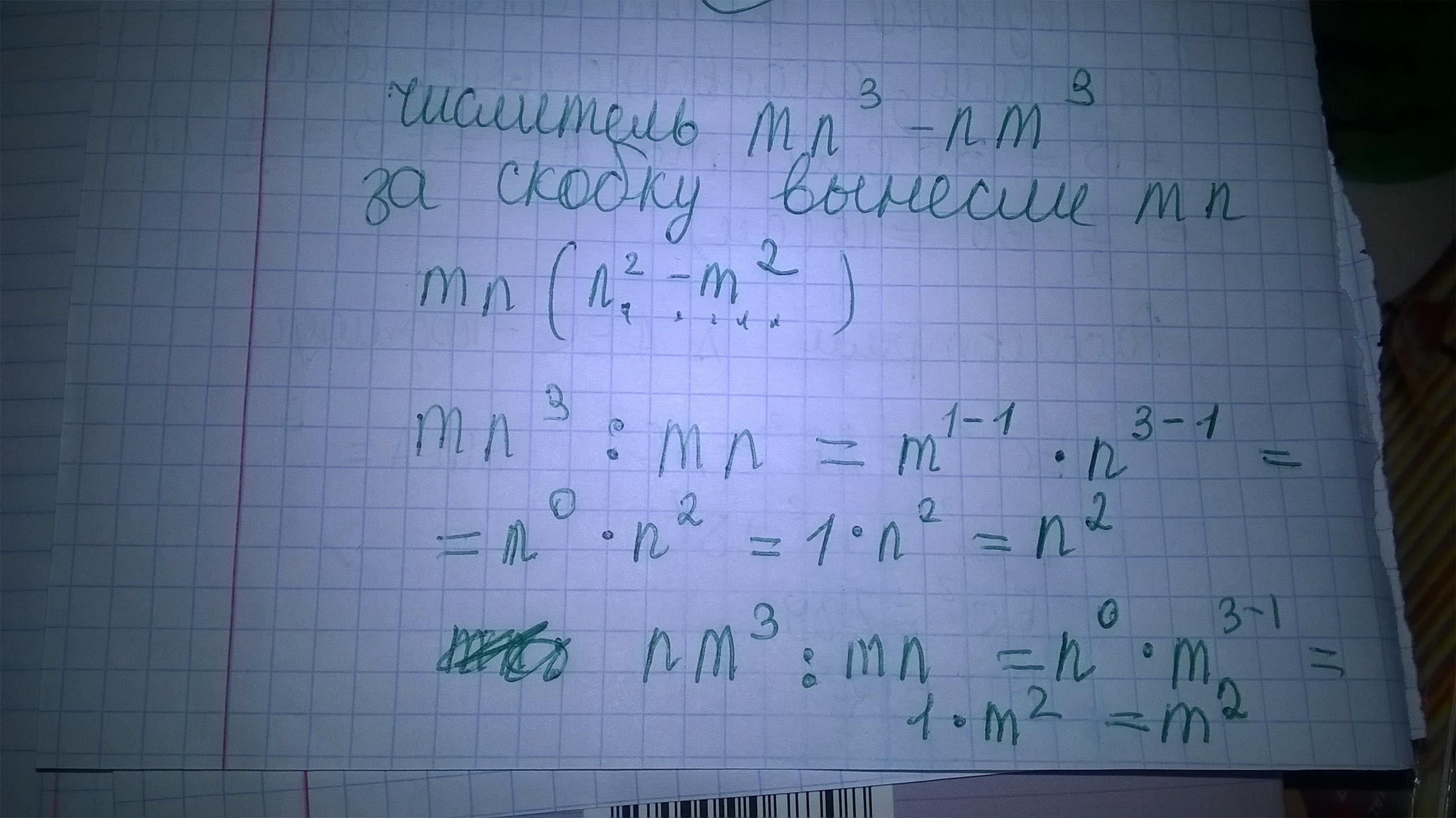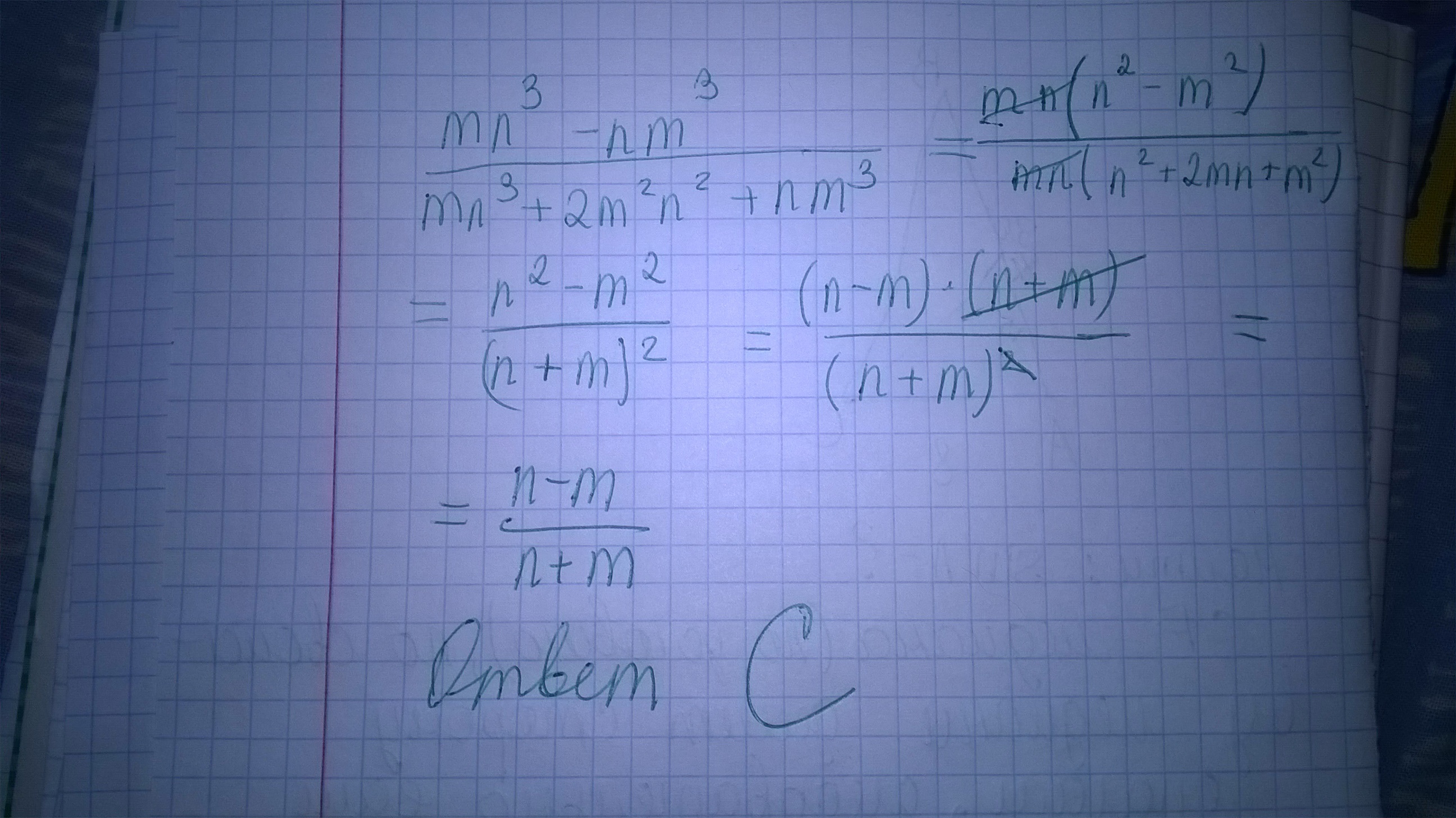 Объяснения: Читаем вслух выражение ,стоящее в числителе mn³-nm³,что два раза прочитали одно и то же? Правильно букву n и m Выбираем в этой строчке (в числителе) буквы с меньшей степенью.Например,есть у нас в числителе есть n³ и n в первой степени,нас интересует n в первой степени.Если в числителе есть m в первой степени и m³,нас интересует меньшая степень и берем m в первой степени.Так вот то ,что прочитали два раза с меньшей степенью выносим за скобку.За скобку выносим mn. Выражение в скобке определяем делением (смотри фото),при деление основание остается прежнем,а показатели степеней вычитаются. ***число или буква в нулевой степени равна 1. В скобке у нас получилось n²-m² В знаменателе проводим такую же операцию за скобку выносим mn,в скобке после деления окажется n²+2mn+m²,а это формула есть такая (а+b)²=a²+2ab+b²,понятно,что наше выражение n²+2mn+m²=(n+m)² Итого:мы получаем в числителе mn*(n²-m²),в знаменателе mn*(n+m)². В числителе и в знаменателе сокращаем одинаковое выражение nm,и у нас остается в числителе (n²-m²),в знаменателе (n+m)². Работаем с числителем Есть такая формула а²-b²=(a-b)*(a+b),ясно,что n²-m²=(n-m)*(n+m) В числителе теперь у нас (n-m)*(n+m),в знаменателе (n+m)² Мы сокращаем (n+m) и (n+m)² Понятно,что (n+m)²=(n+m)*(n+m) Итак,получается (n-m)* (n+m)/(n+m)*(n+m) В числителе и знаменателе сокращаем одинаковое выражение n-m,так как (n-m):(n-m)=1,это как при деление одинаковых чисел например 5:5=1. После сокращения остается n-m/n+m ♦ Ответ С