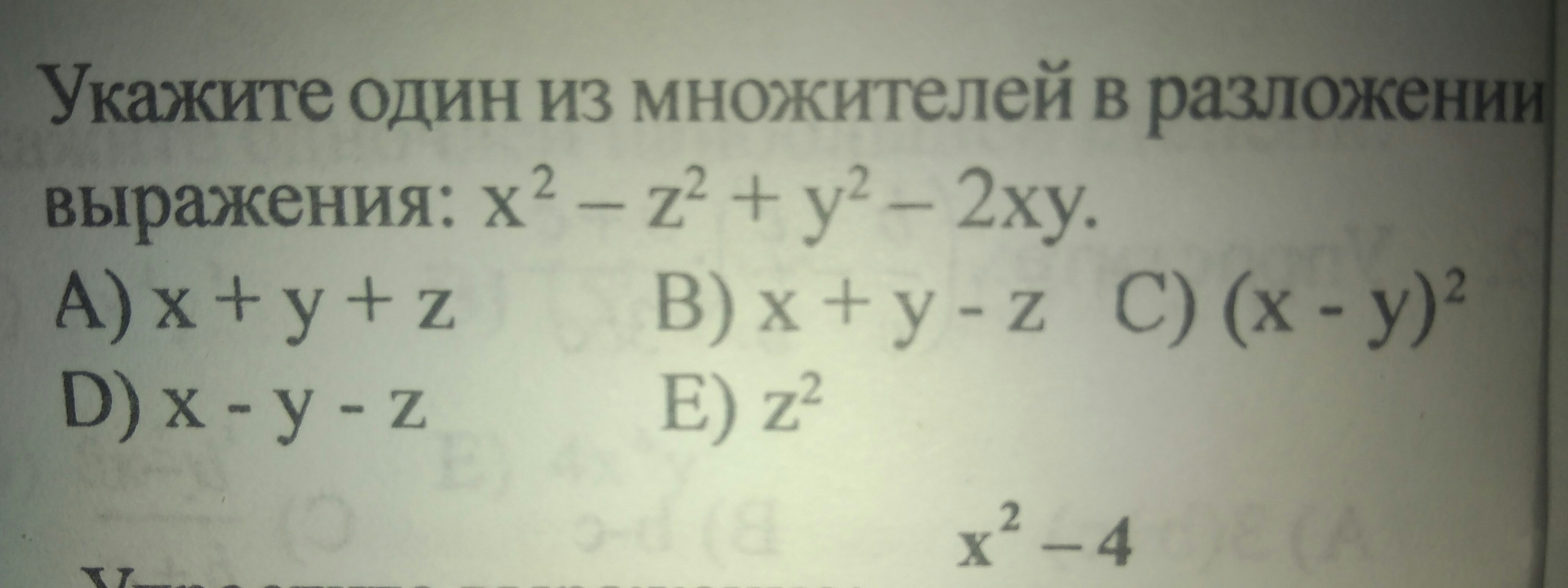 (x^2-2xy+y^2)-z^2=(x-y)^2-z^2=(x-y-z)(x-y+z). Ответ: буква D.