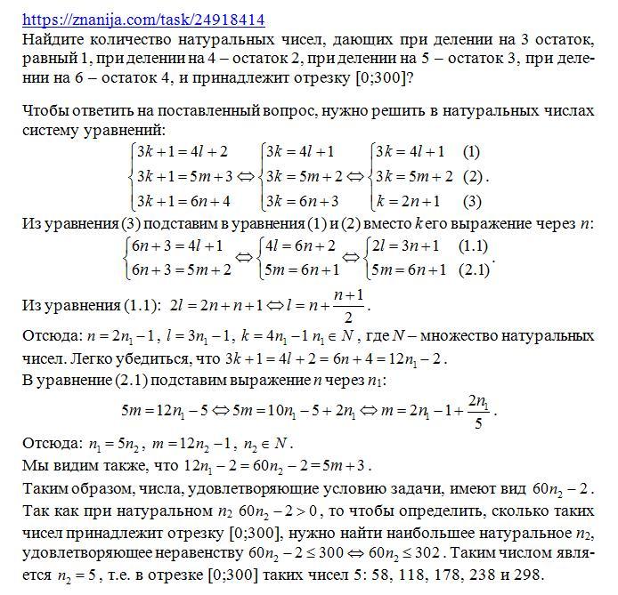 Найдите количество натуральных чисел, дающих при делении на 3 остаток, равный 1, при делении на 4 - остаток 2, при делении на 5 - остаток 3, при делении на 6- остаток 4, и принадлежит отрезку [0;300]?