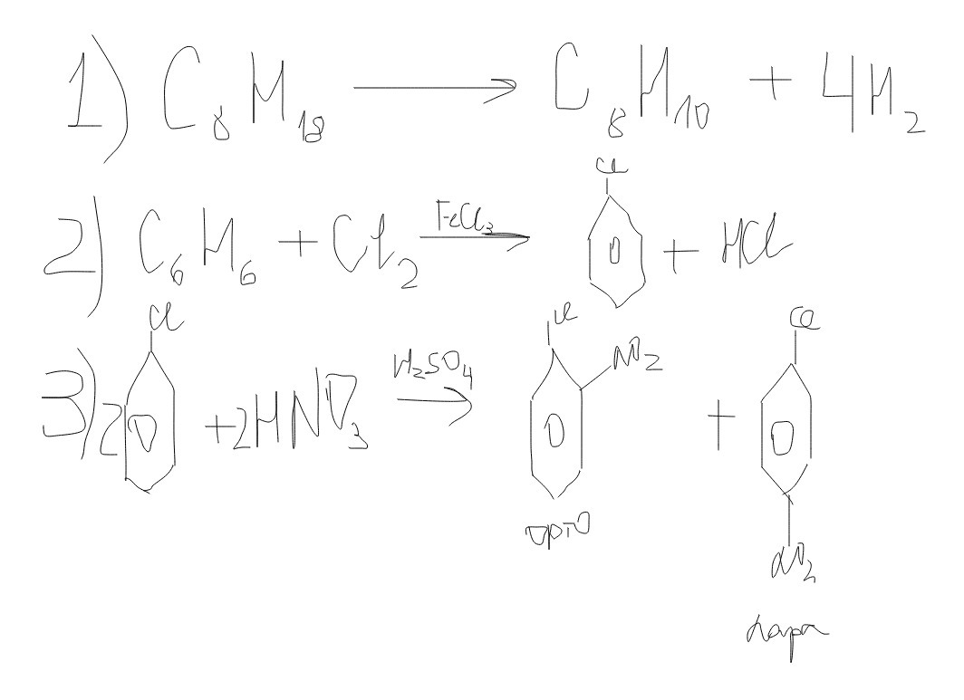 Приведите формулы гомологов бензола, которые могут быть получены при дегидроциклизации н-октана С8Н18. Получите из бензола орто-хлорнитробензол и пара-хлорнитробензол.