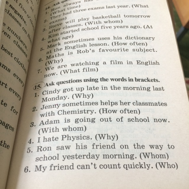 №15 1Why did Cindy get up late in the morning last Monday? 2How often does Jenny help her classmates with Chemistry? 3With whom is Adam going out of school now? 4Why do you hate Physics? 5Whom did Ron see on the way to school yesterday morning? 6Who can't count quickly?