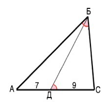 в треугольнике АБЦ проведена прямая БД так, что угол БДЦ равно углу АБЦ . на стороне АЦ получаутся отрезки АД равно 7 сантиметров и ДЦ 9 сантиметров.определить сторону БЦ и отношение БД:БА