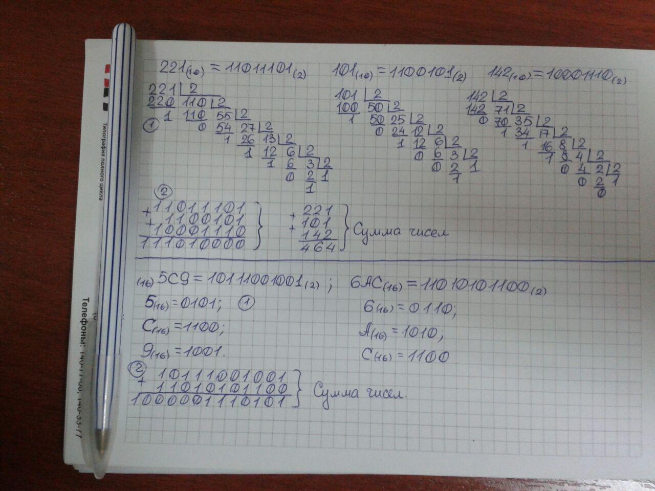 P.S. в задании №1 для перевода в 2-ичную систему счисления необходимо было выполнить деление на 2, потом сложение выполнялось в 10-чной и 2-ичной системах. В задании №2 перевод из 16-чной в 2-ичную систему счисления выполнялся путём представления каждой составляющей 16-ичного числа в виде тетрады числе двойчной системы; сложение выполнено тоько в двоичной системе.