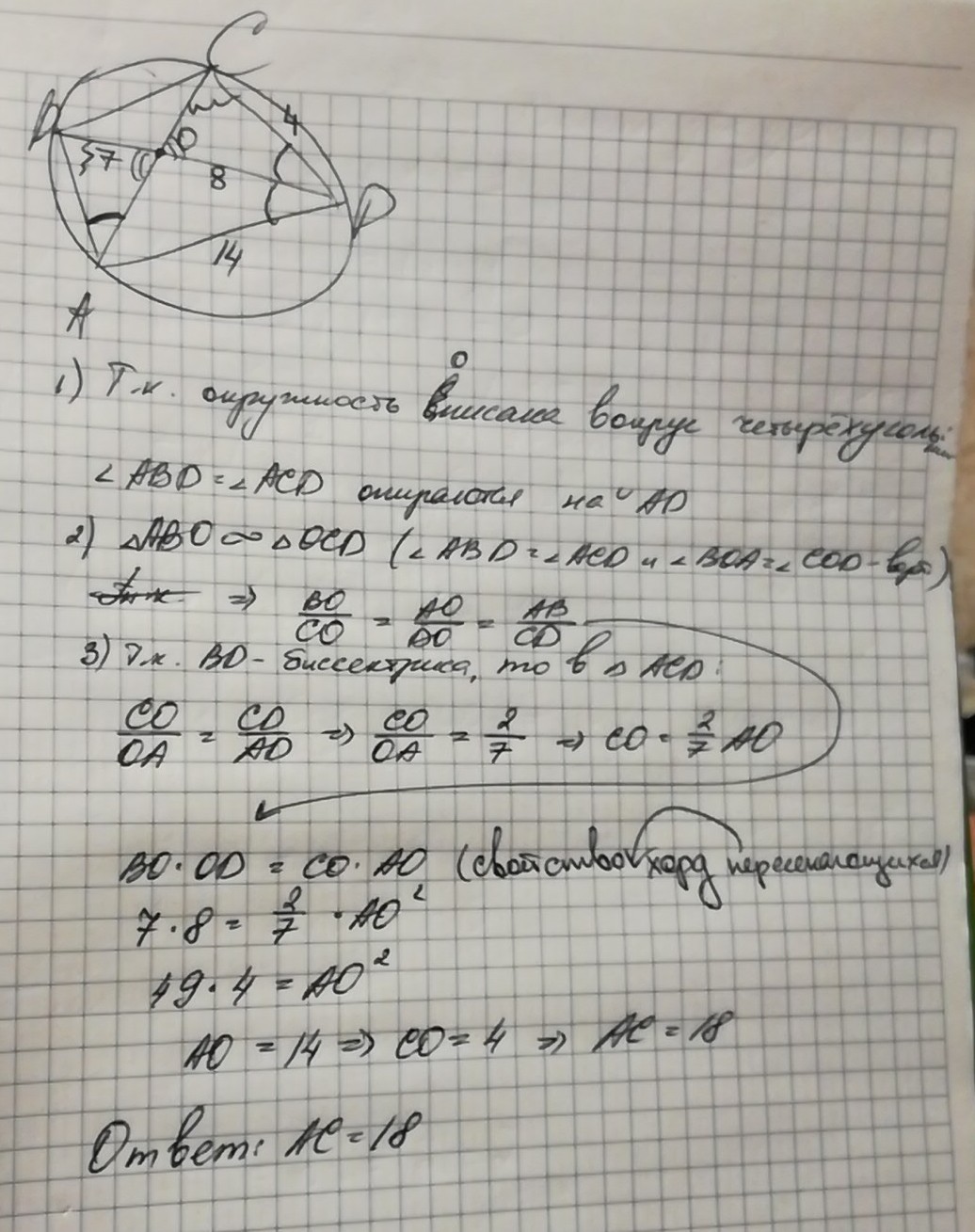 Четырехугольник АВСД вписан в окружность.АД=14,СД=4, ВД биссектрисса углаАДС. О ТОЧКА ПЕРЕСЕЧЕНИЯ ДИАГОНАЛЕЙ ДЕЛИТ ВД на отрезки ВО=7, ОД=8. Найти АС.