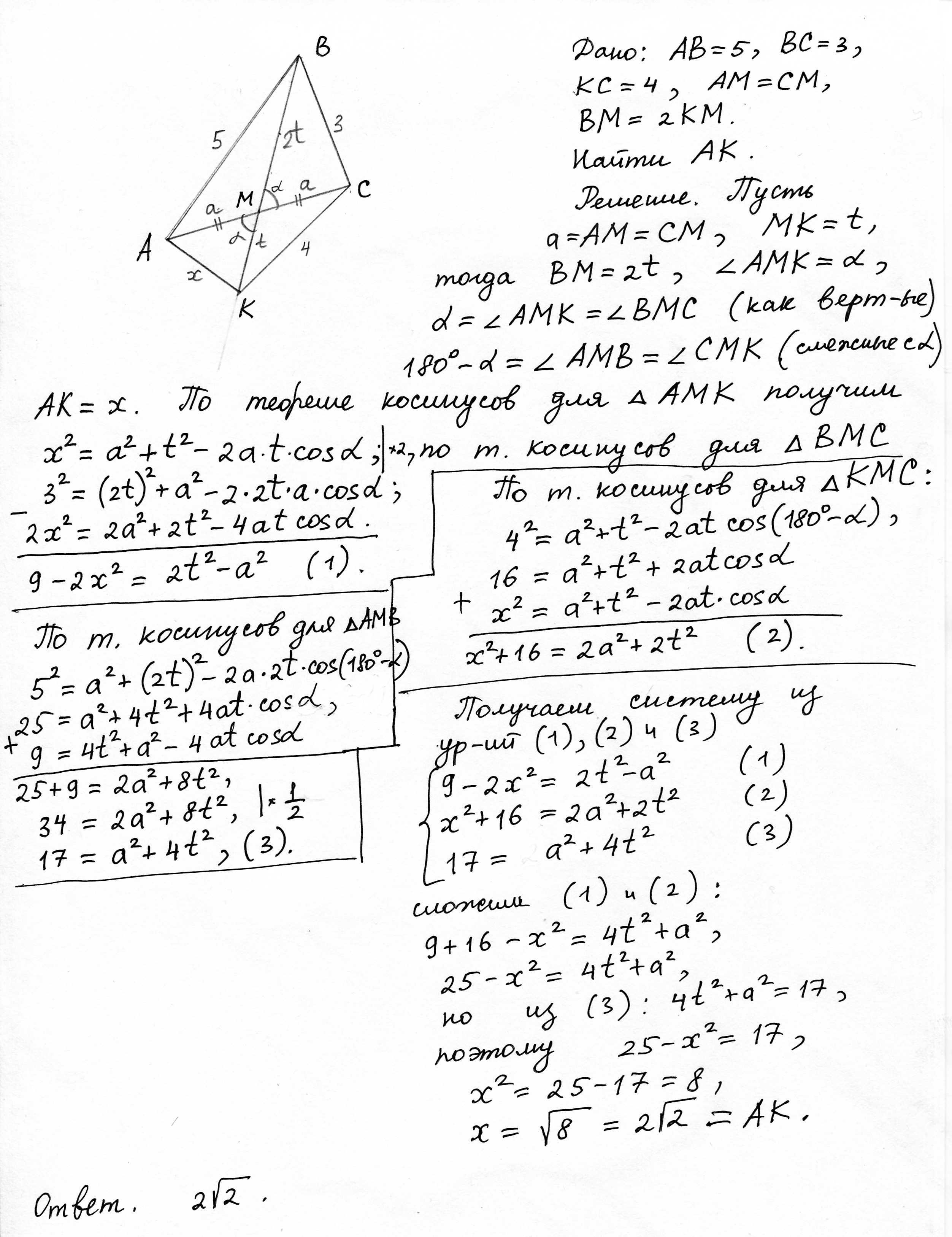 Я решил через теорему косинусов, не знаю проходили ли вы её. Решение на листочке.