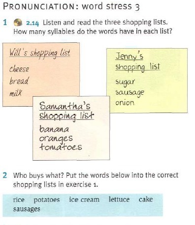 №1 Will's shopping list-все слова имеют 1 слог , Jenny's shopping list-все слова имеют 2 слога , Samantha's shopping list-все слова имеют 3 cлога. В Will's shopping list добавим продукты ice cream, cake В Jenny's shopping list добавим rice, sausages В Samantha's shopping list добавим lettuce, potatoes