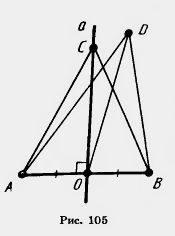 Доказательство. Пусть А к В — данные точки, а — прямая, проходящая через середину О отрезка АВ перпендикулярно к нему (рис. 105). Мы должны доказать, что: