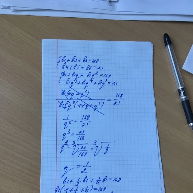 Знайти перший член геометричної прогресії, яка складається з 6 членів сума перших трьох 168, а трьох останніх 21