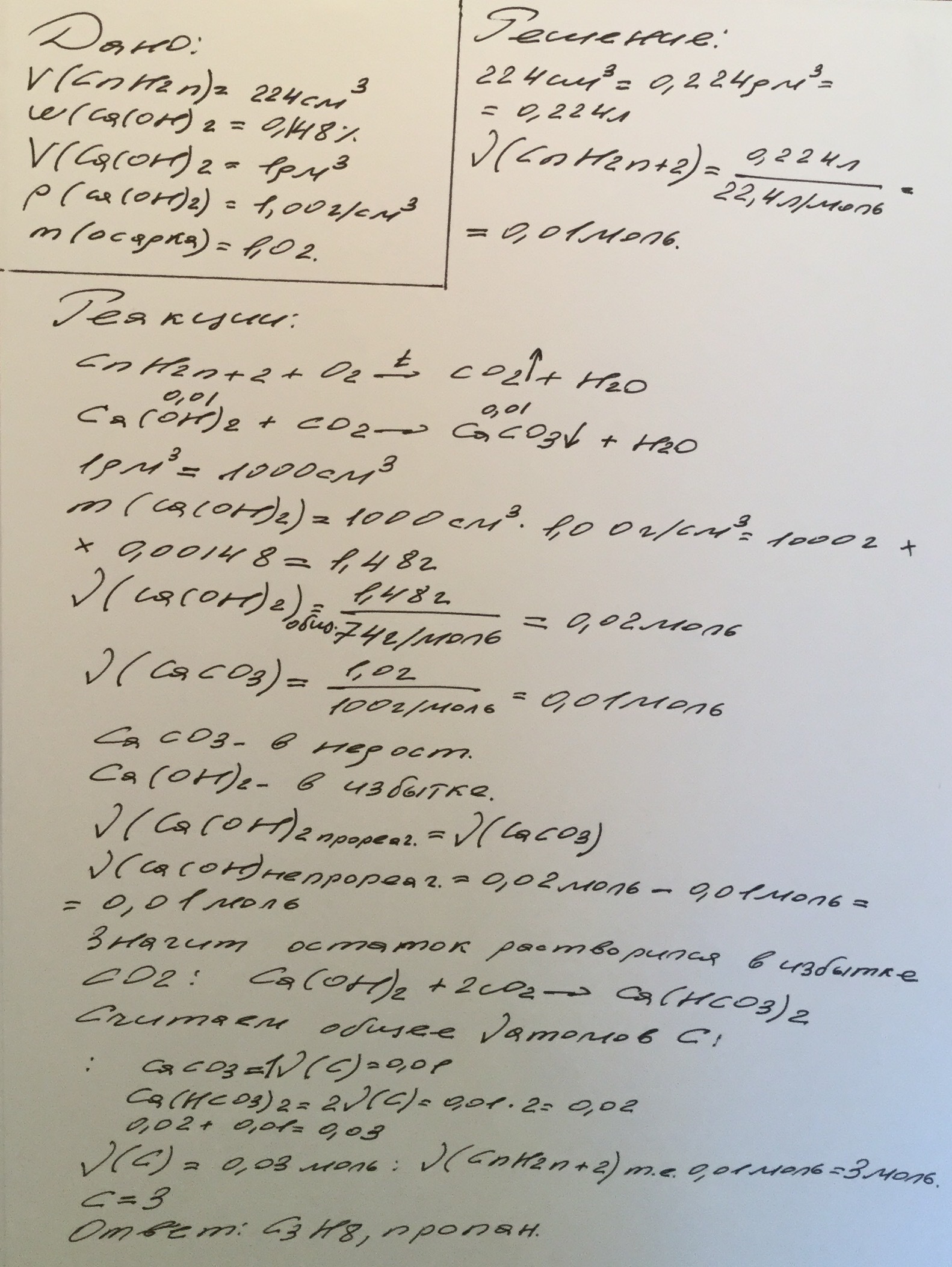Газообразный алкан объемом 224 см^3(н.у.) полностью сожгли и продукты сгорания пропустили через известковую воду с w[Ca(OH)2]=0.148% объемом 1 дм^3 (p=1.00 г/см^3). Осадок, клторый вначаде выпал, затем частично растворился. Масса не растворившегося осадка 1,0 г. Какова формула алкана