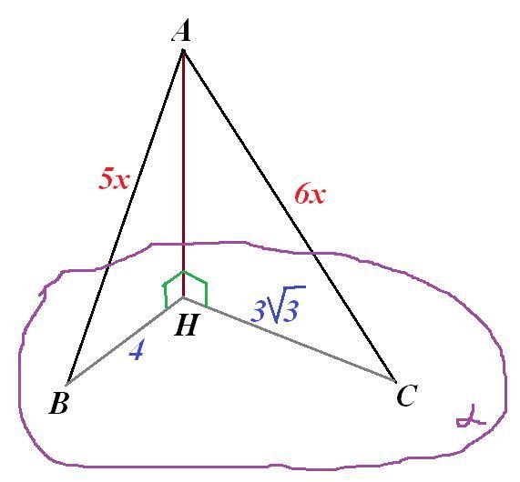 С некоторой точки до плоскости проведены две наклонные, длины которых относятся как 5: 6. Найдите длину перпендикуляра, проведенного с этой точки до плоскости, если проекции наклонных равны 3√3 см и 4 см.