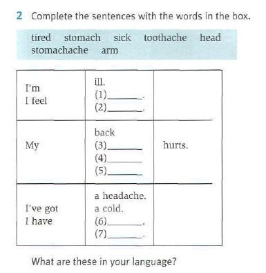 I'm tired -Я устал. I feel tired-Я чувствую, что я устал. I'm sick( I feel sick)-Меня тошнит. My back(head, arm,stomach)-У меня болит спина(голова, рука, живот) hurts I've got (have) a headache(a toothache, a stomachache)-У меня головная (зубная) боль, боль в животе.
