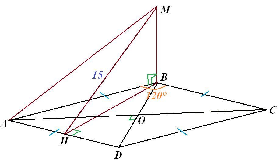 С вершины В ромба АВСD, площадь которого равна 166.3 cm^2, проведены перпендикуляр к МВ плоскости ромба. Угл В = 120 градусов, МН перпендикулярно к АD, Н находится на прямой АD, МН = 15 см.