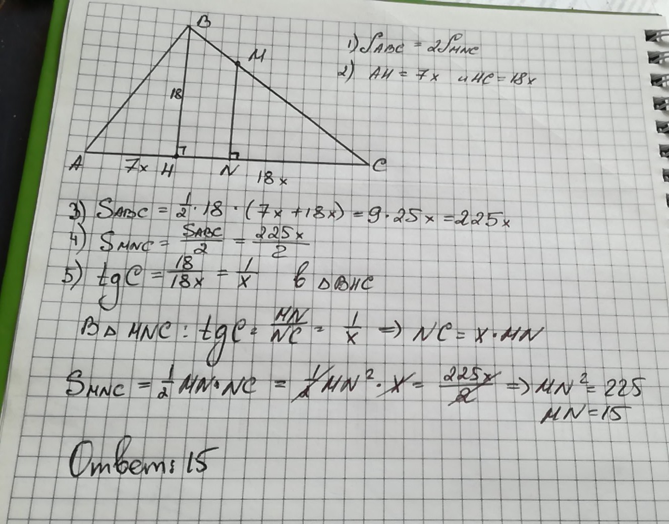 Высота треугольника длиной 18 делит его основание в отношении 7:18 найти длинну отрезка пралельного этой высоте и делящего площядь треугольника пополам