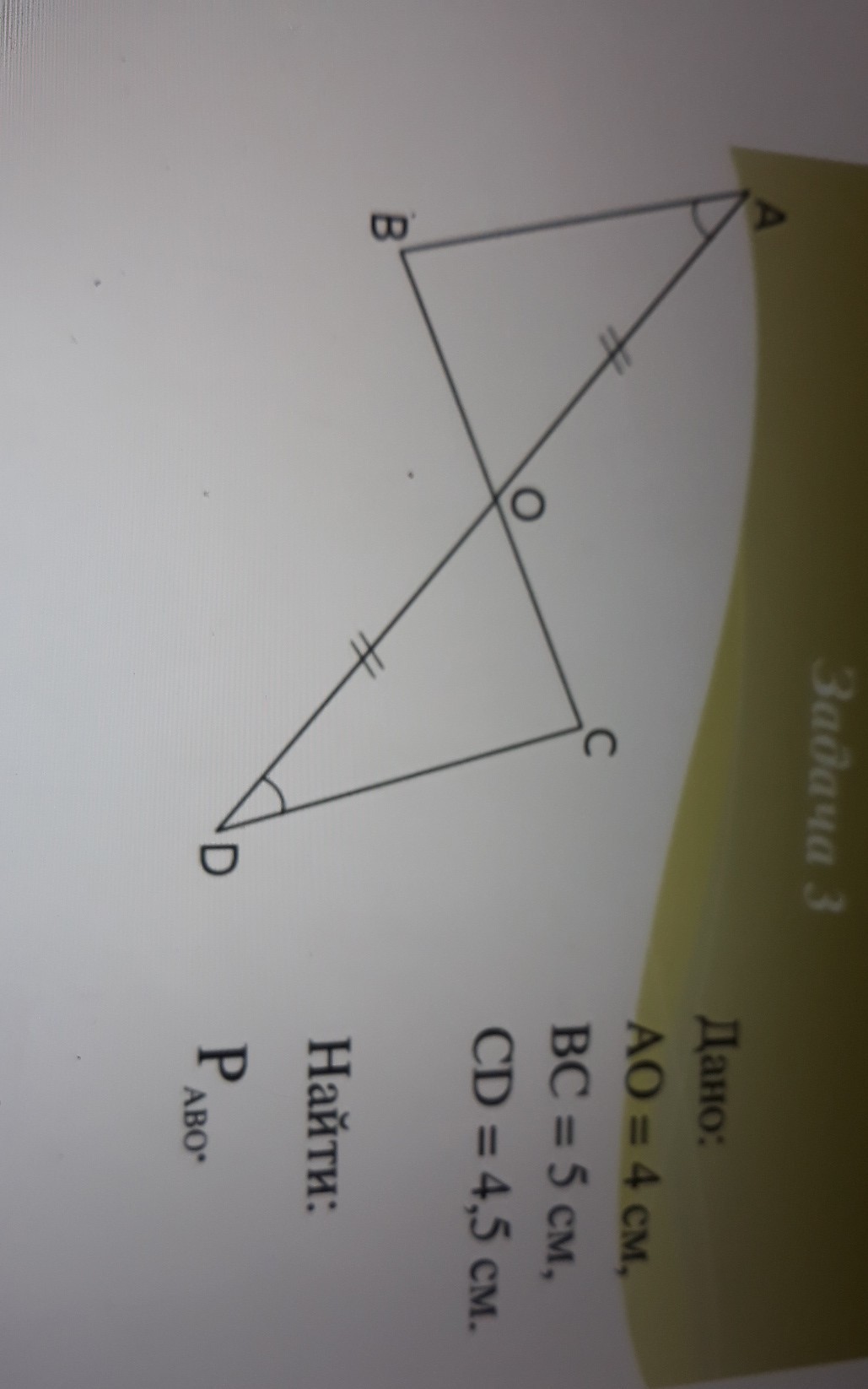 Из равенства треугольников следует и равенство всех его элементов, т.е. ВО = ОС = 1/2 · ВС = 1/2 · 5 = 2,5 (см) и АВ = CD = 4,5 см, а также АО = 4 см (по условию). Тогда периметр ΔАОВ равен: