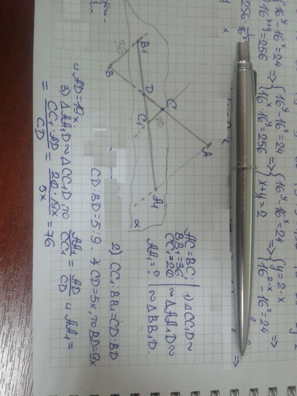 Отрезок АВ пересекает плоскость а. Через точки А, В и середину С этого отрезка проведены параллельные прямые, пересекающие а в точках А1, В1 и С1 соответственно. Найдите АА1, если ВВ1=36 и СС1=20