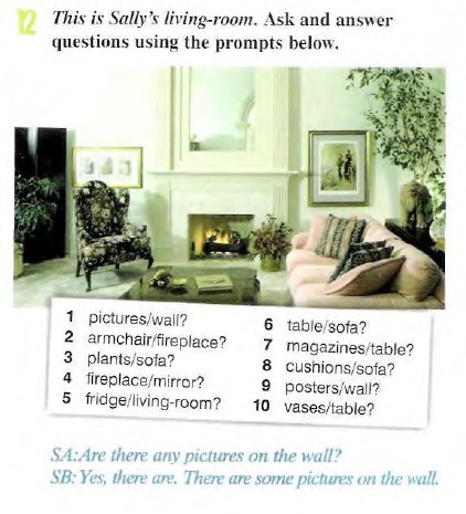 2Is there an armchair near the fireplace?-Yes, there is. There is an armchair near the fireplace. 3Are there any plants near the sofa?-Yes, there are.There are some plants near the sofa. 4Is there a fireplace under the mirror? -Yes, there is.There is a fireplace under the mirror. 5Is there a fridge in the living-room? -No, there isn't.There is no fridge in the living-room. 6Is there a table in front of the sofa?-Yes, there is. There is a table in front of the sofa. 7Are there any magazines on the table? Yes, there are. There are some magazines on the table. 8Are there any cushions on the sofa?-Yes, there are. There are some cushions on the sofa. 9 Are there any posters on the wall? No, there aren't. There aren't any posters on the wall. There are some pictures on it. 10Are there any vases on the table? -No, there aren't.There aren't any vases on the table.